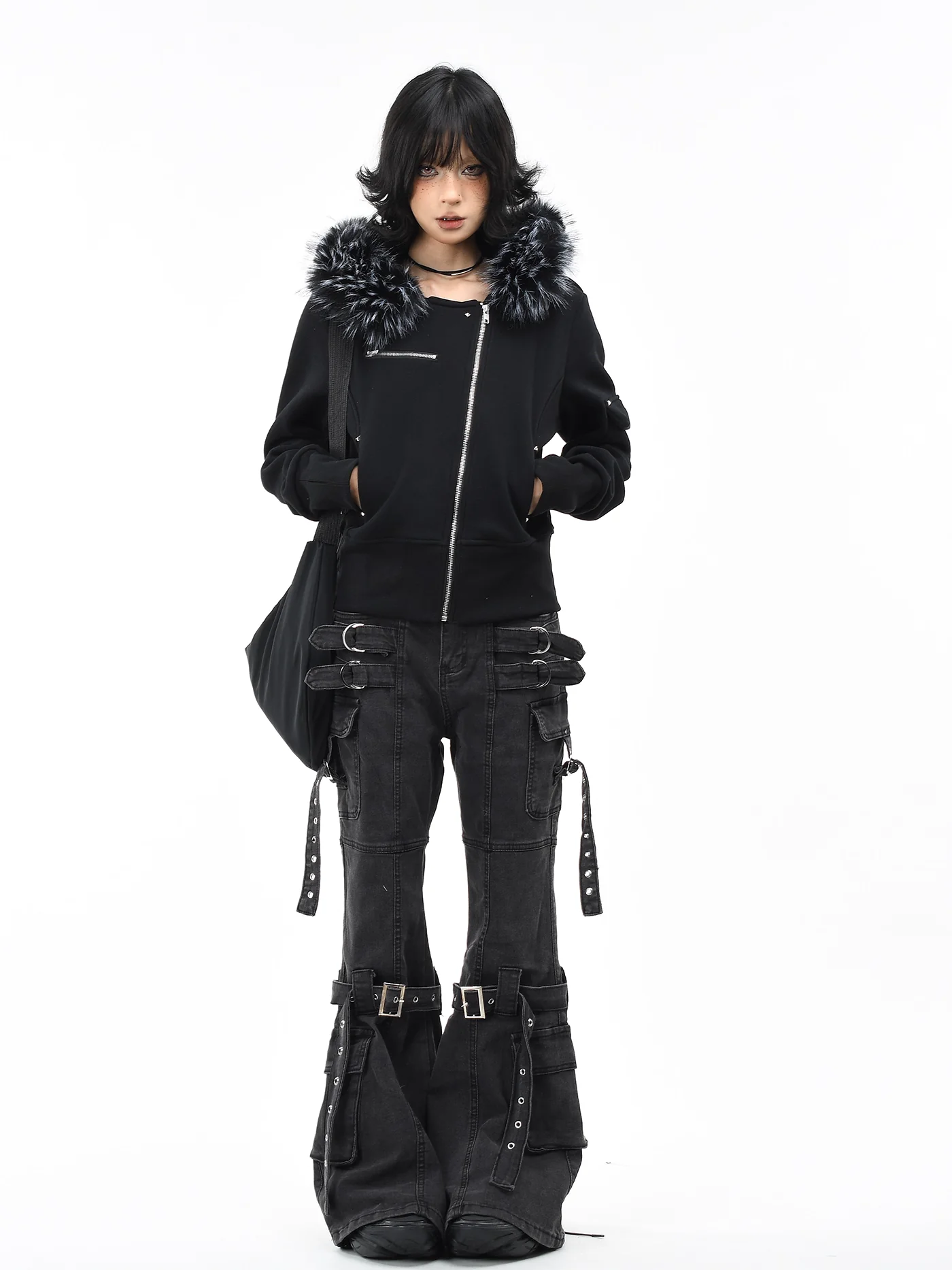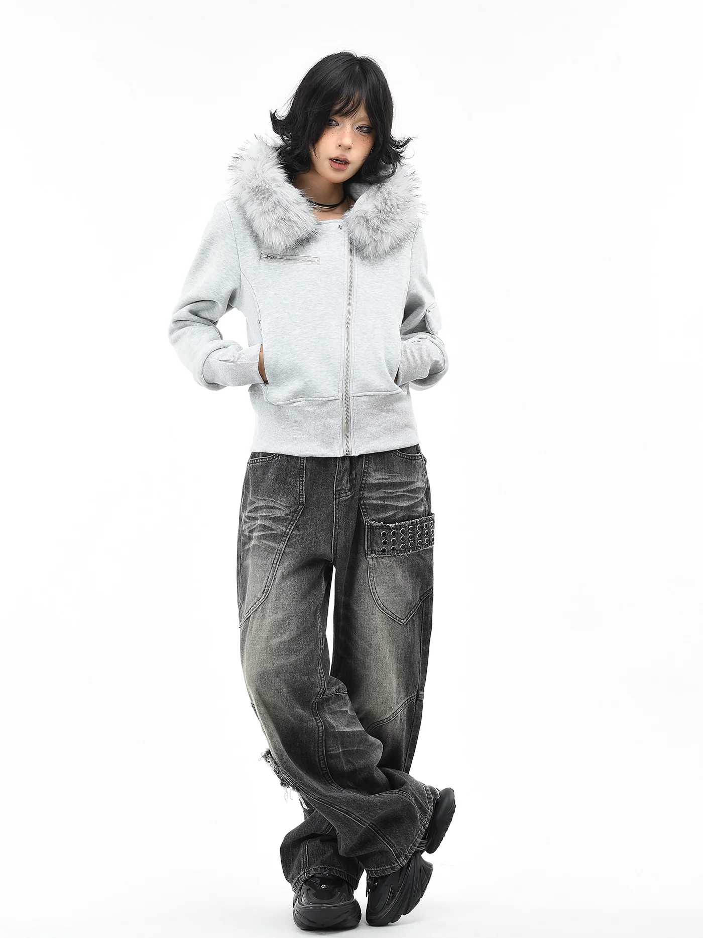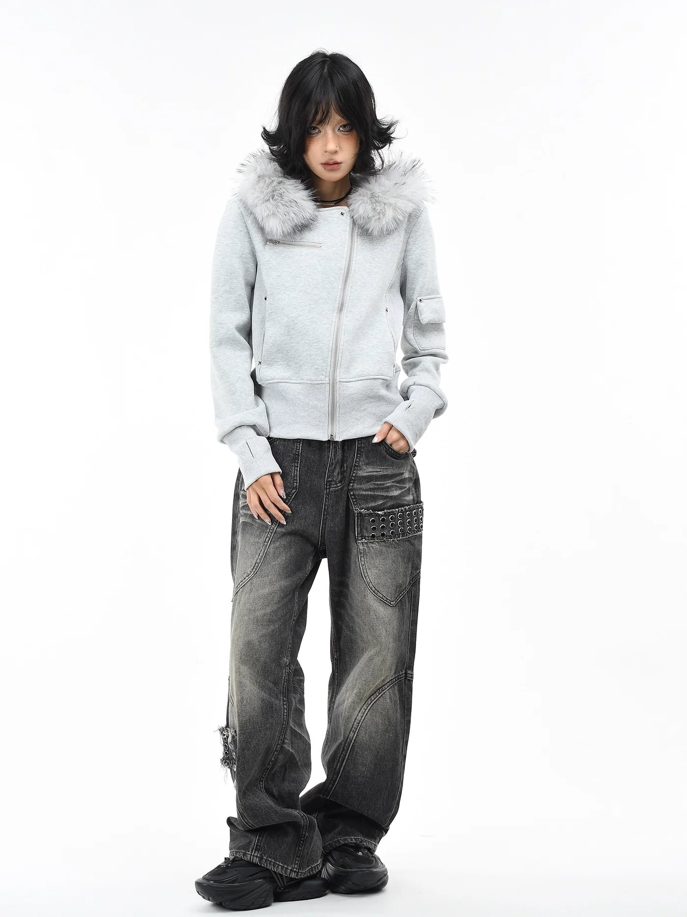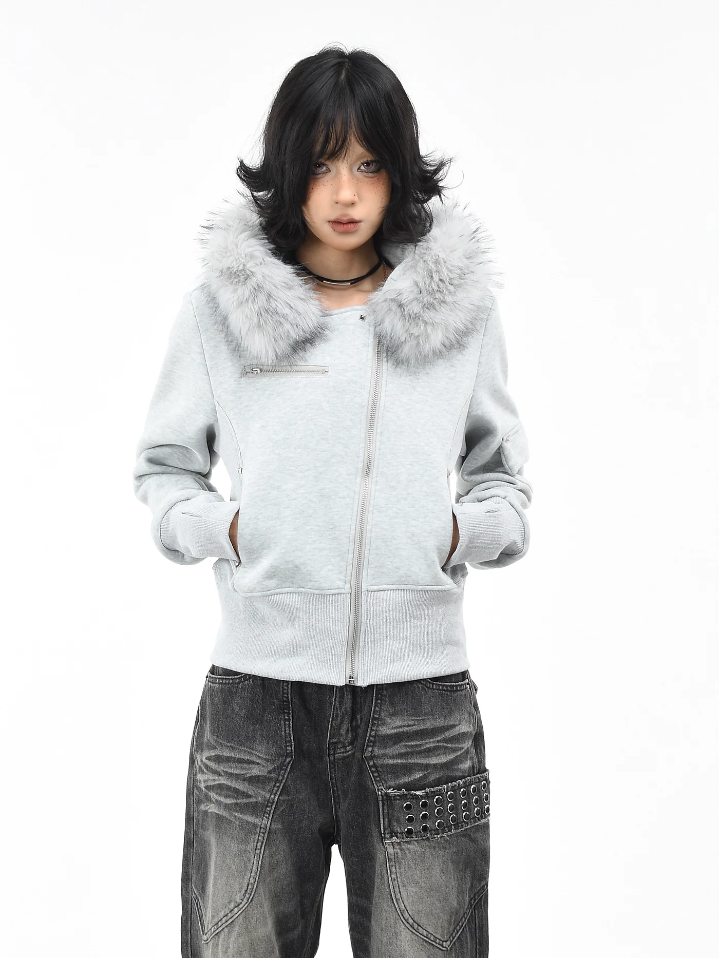 Be the first to review “‘Dark Crest’ Faux Fur Collar Asymmetrical Hoodie Jacket”