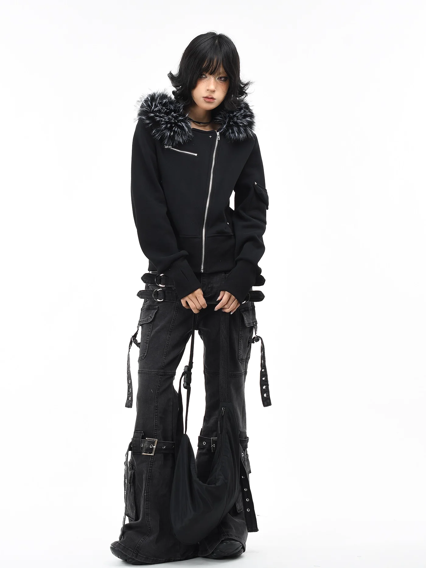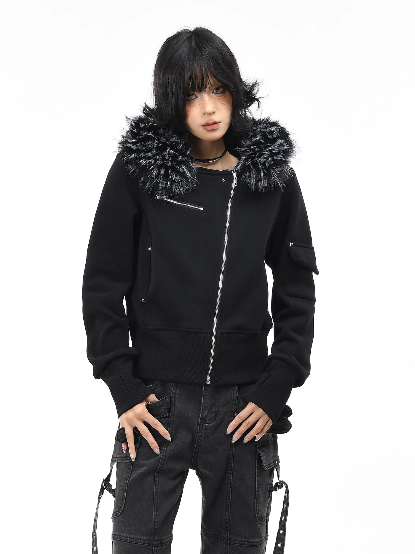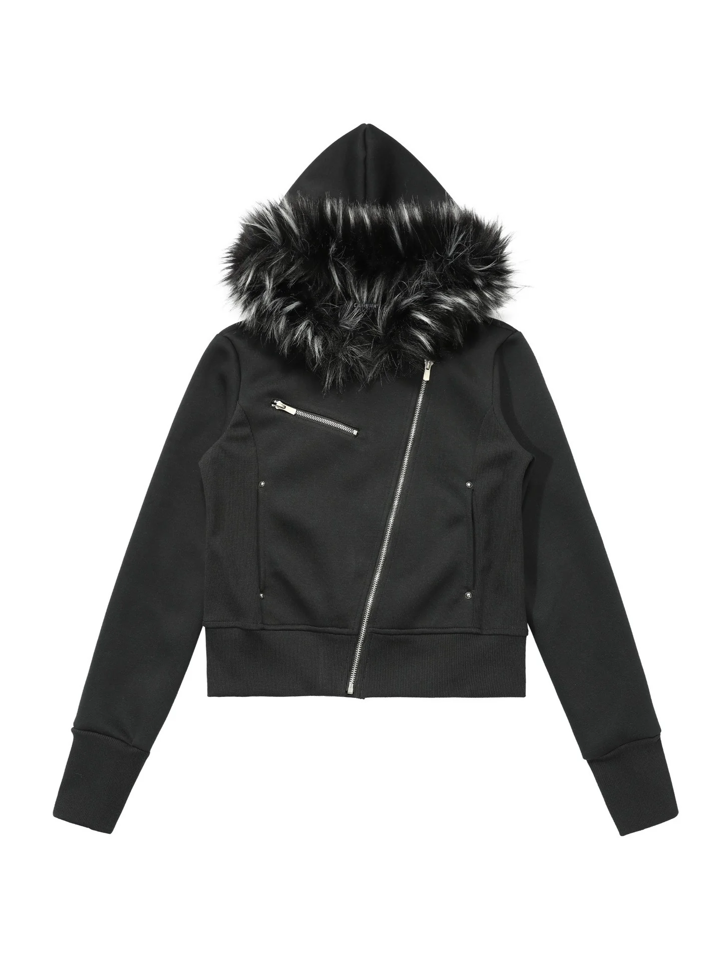 ‘Dark Crest’ Faux Fur Collar Asymmetrical Hoodie Jacket