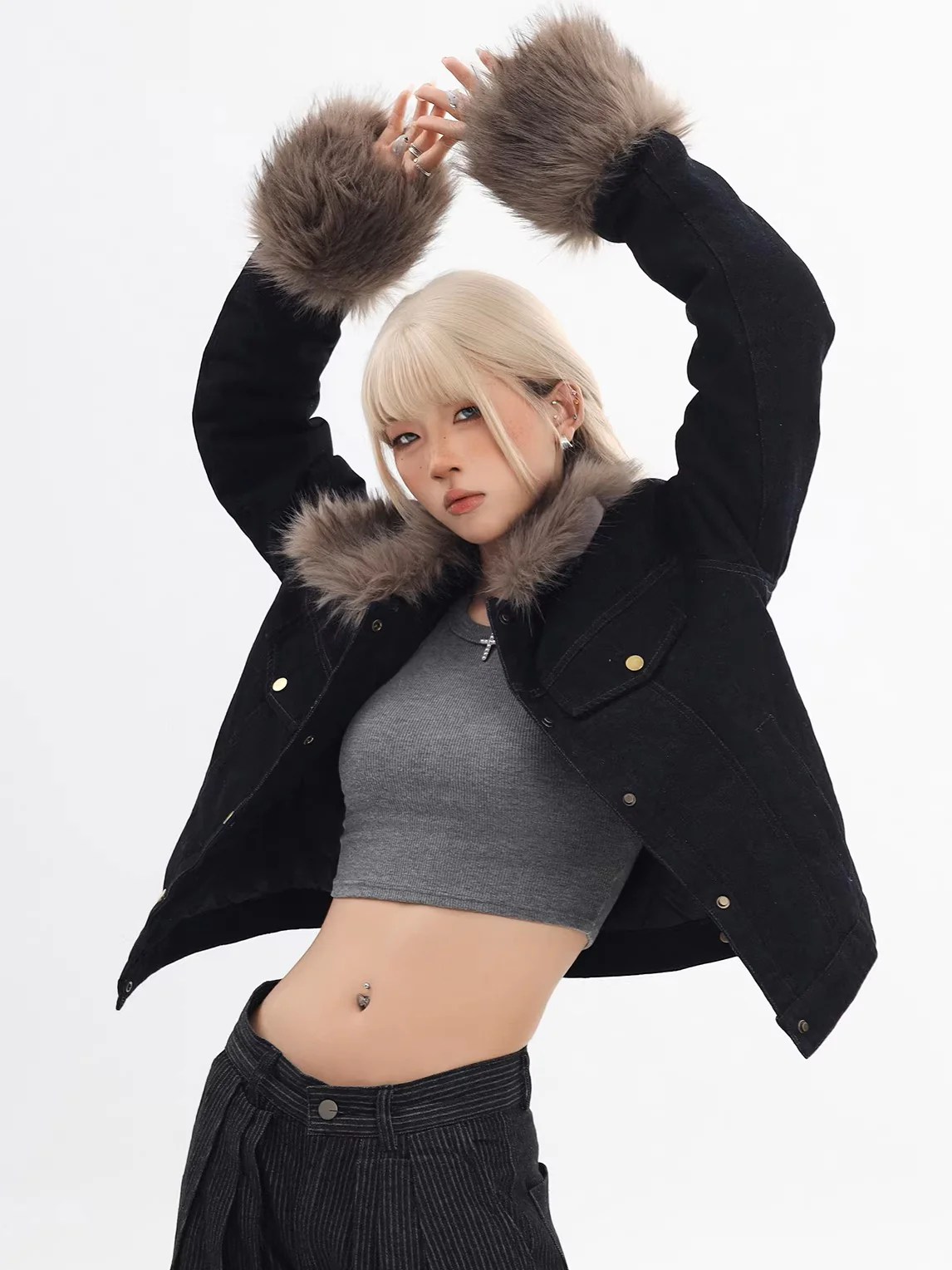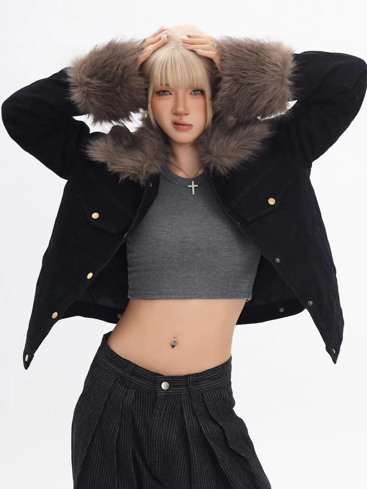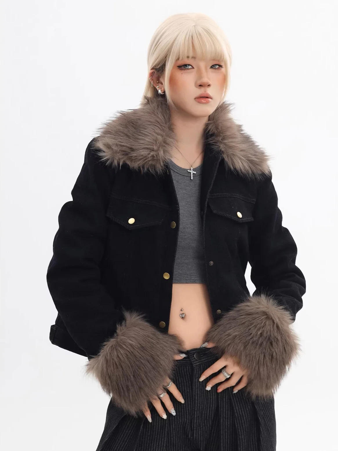 Be the first to review “‘Blue Haven’ Vintage Fur-Collar Cropped Denim Puffer Jacket”