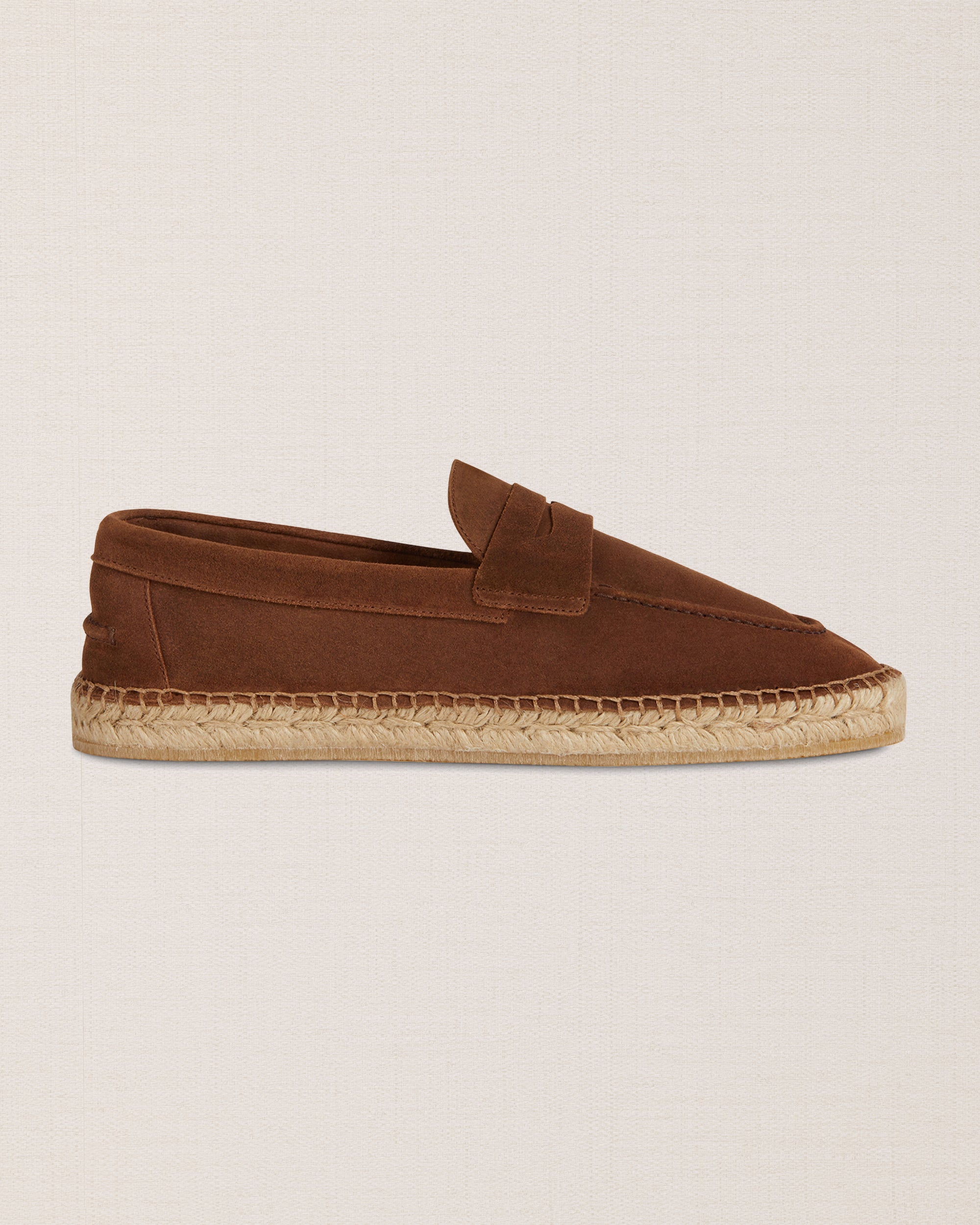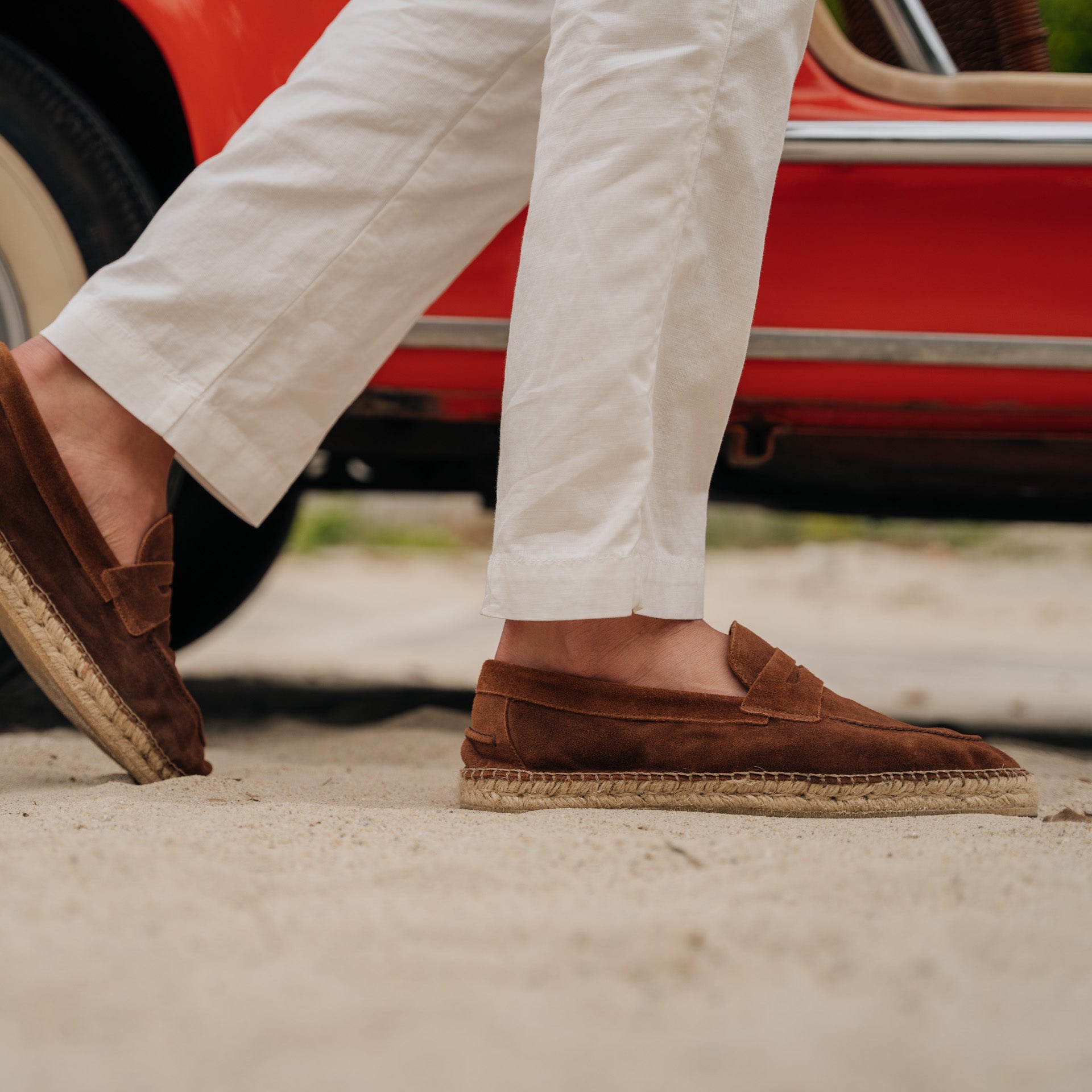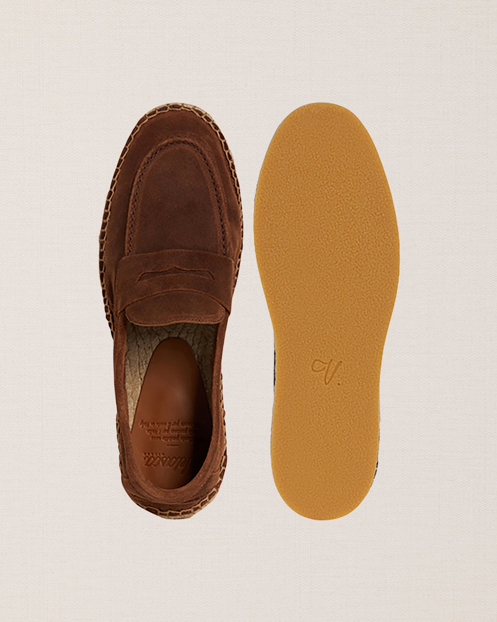 Not a moccasin, neither a classic espadrille. This is our espadrilles with mask, in suede calfskin. The leather upper is joined to the sole with a hand-stitched seam. Here it meets hand-woven rope and rubber. Vintage combination: long-sleeved linen polo shirt and cotton trousers.