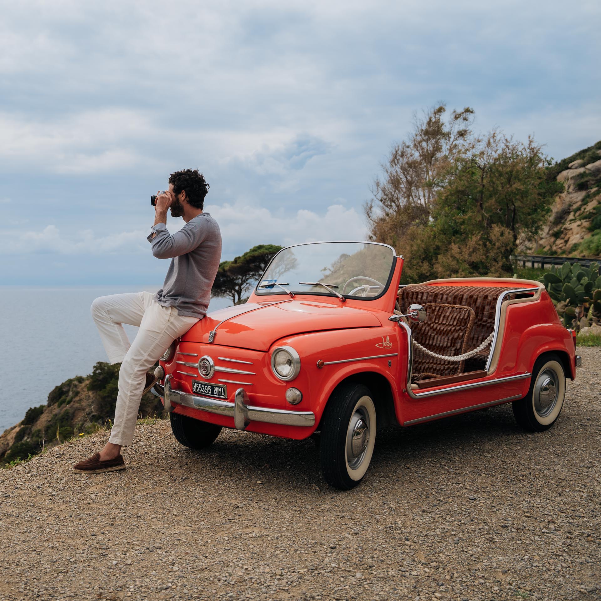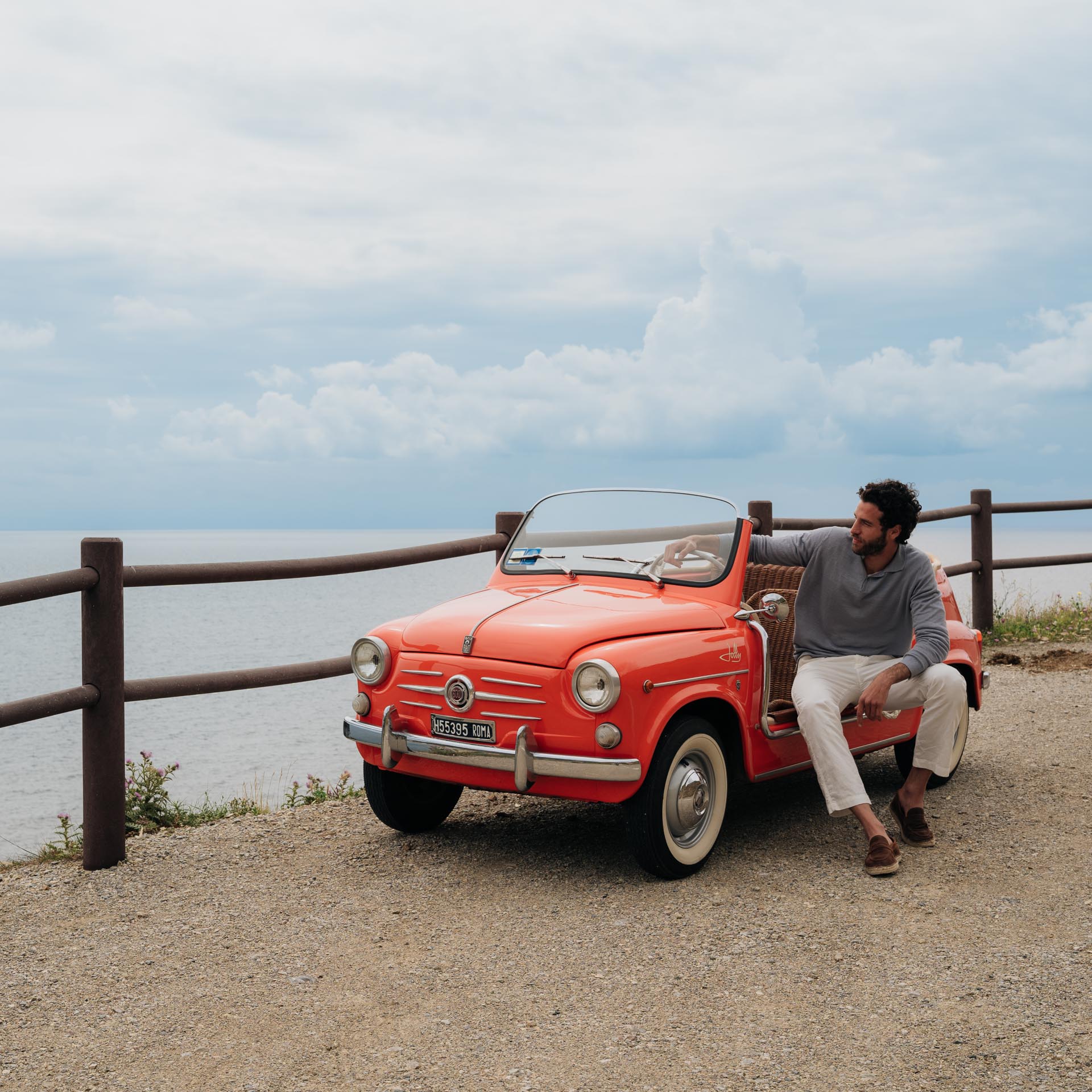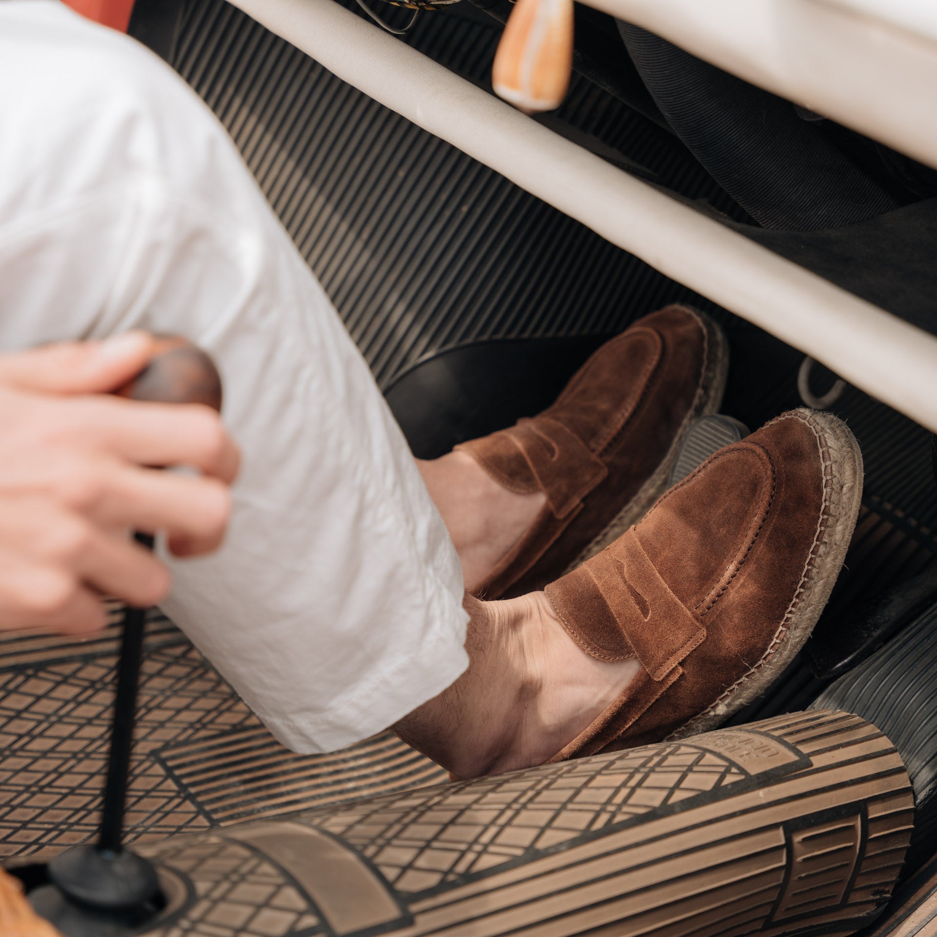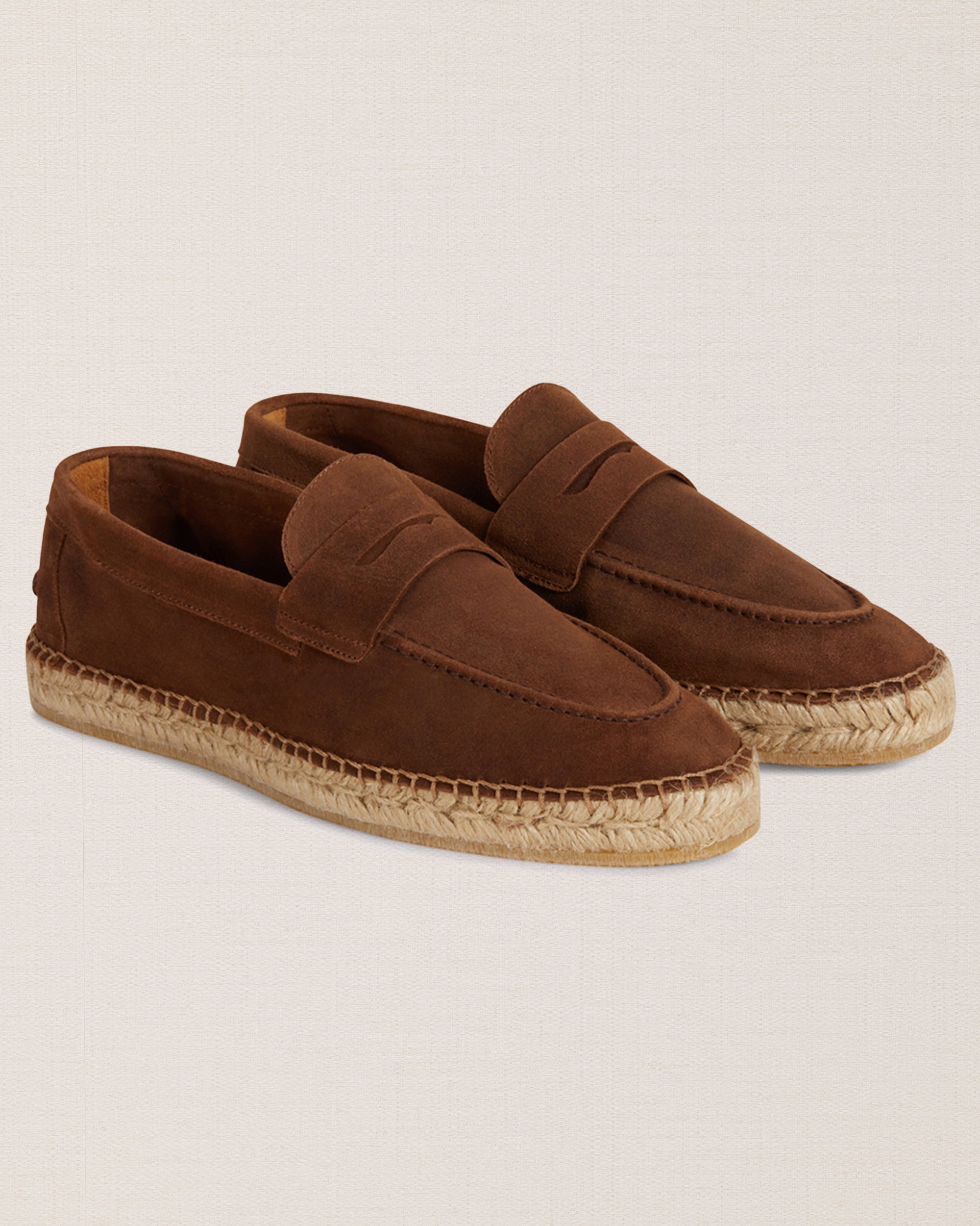 Not a moccasin, neither a classic espadrille. This is our espadrilles with mask, in suede calfskin. The leather upper is joined to the sole with a hand-stitched seam. Here it meets hand-woven rope and rubber. Vintage combination: long-sleeved linen polo shirt and cotton trousers.