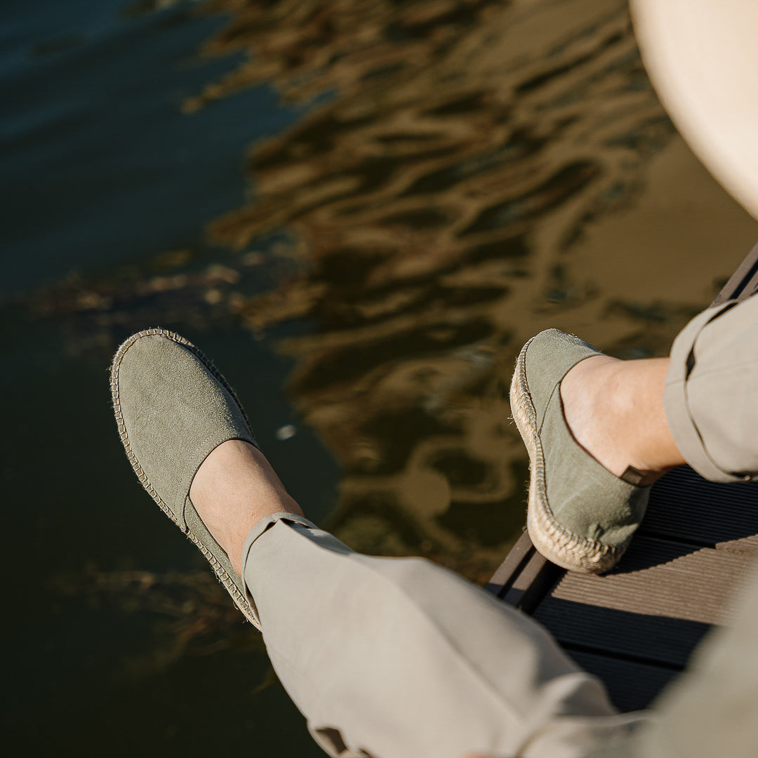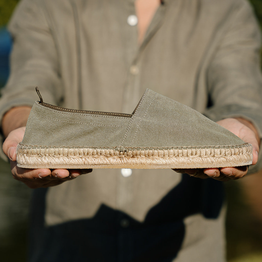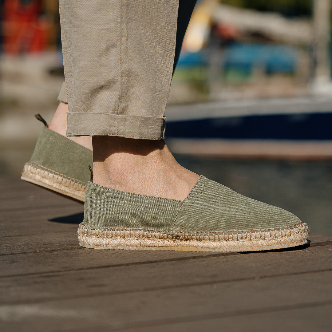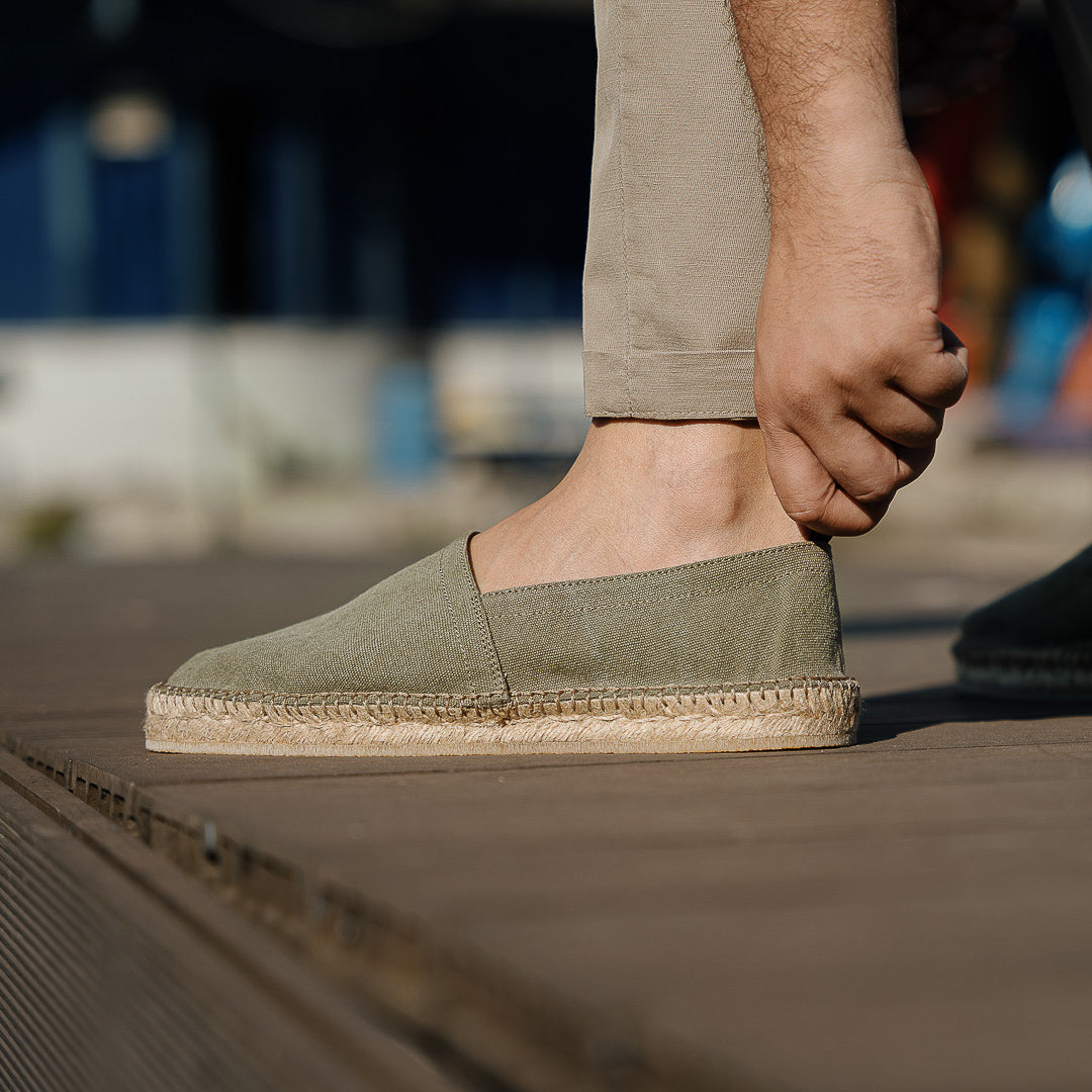 In our Espadrilles in canvas, the fabric is sewn by hand to the sole, where it meets the hand woven rope and the rubber surface. Wear them with cotton trousers with pleats and a green Korean-style shirt in pure linen. A touch of class: a Panama hat. To the beach, for a campfire dinner.