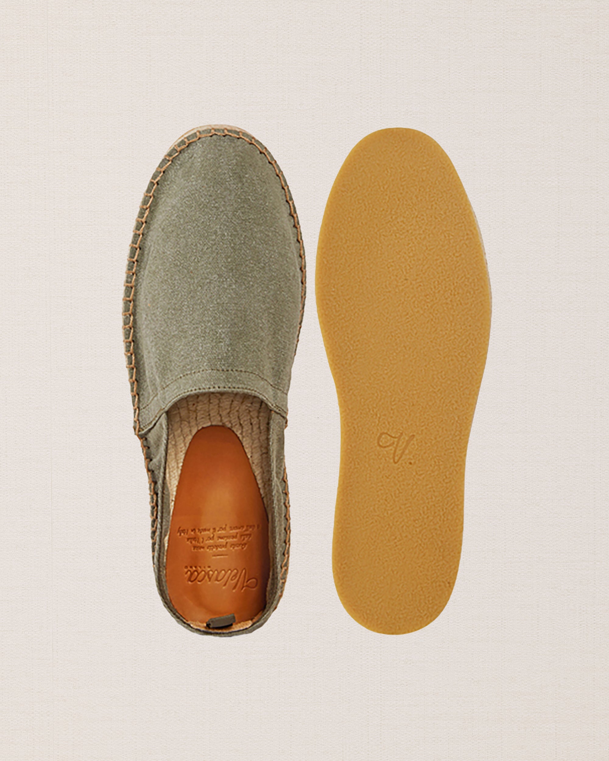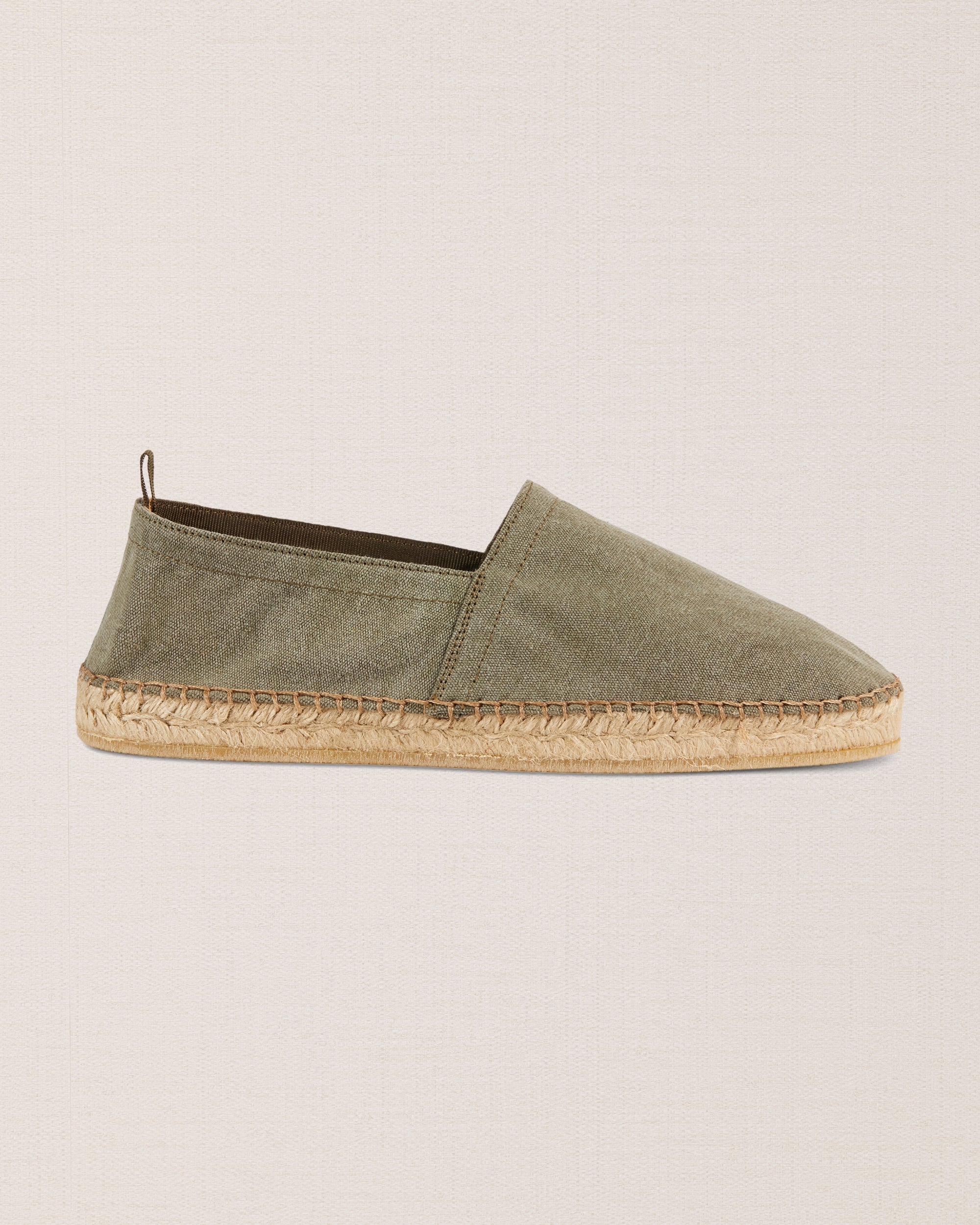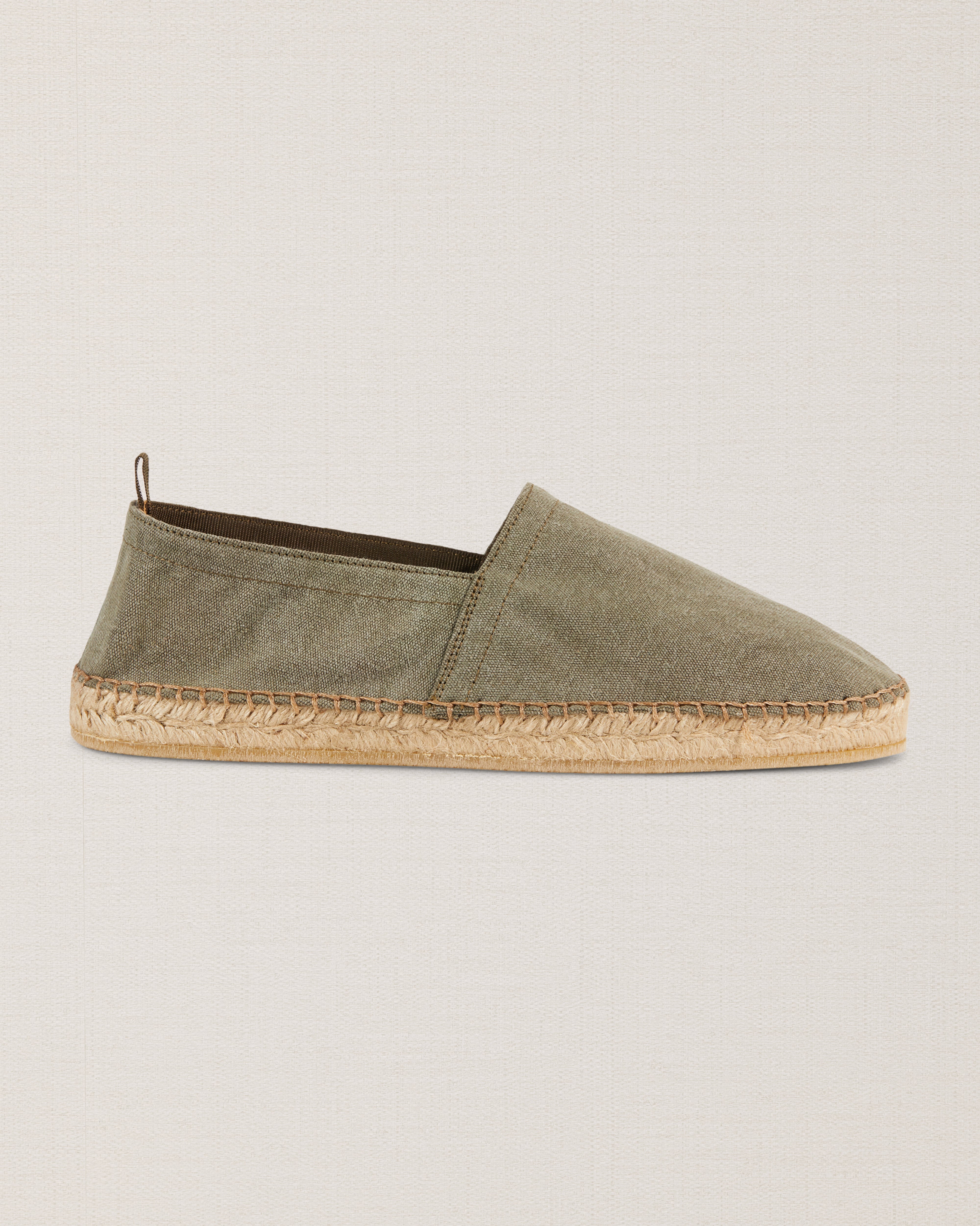 In our Espadrilles in canvas, the fabric is sewn by hand to the sole, where it meets the hand woven rope and the rubber surface. Wear them with cotton trousers with pleats and a green Korean-style shirt in pure linen. A touch of class: a Panama hat. To the beach, for a campfire dinner.