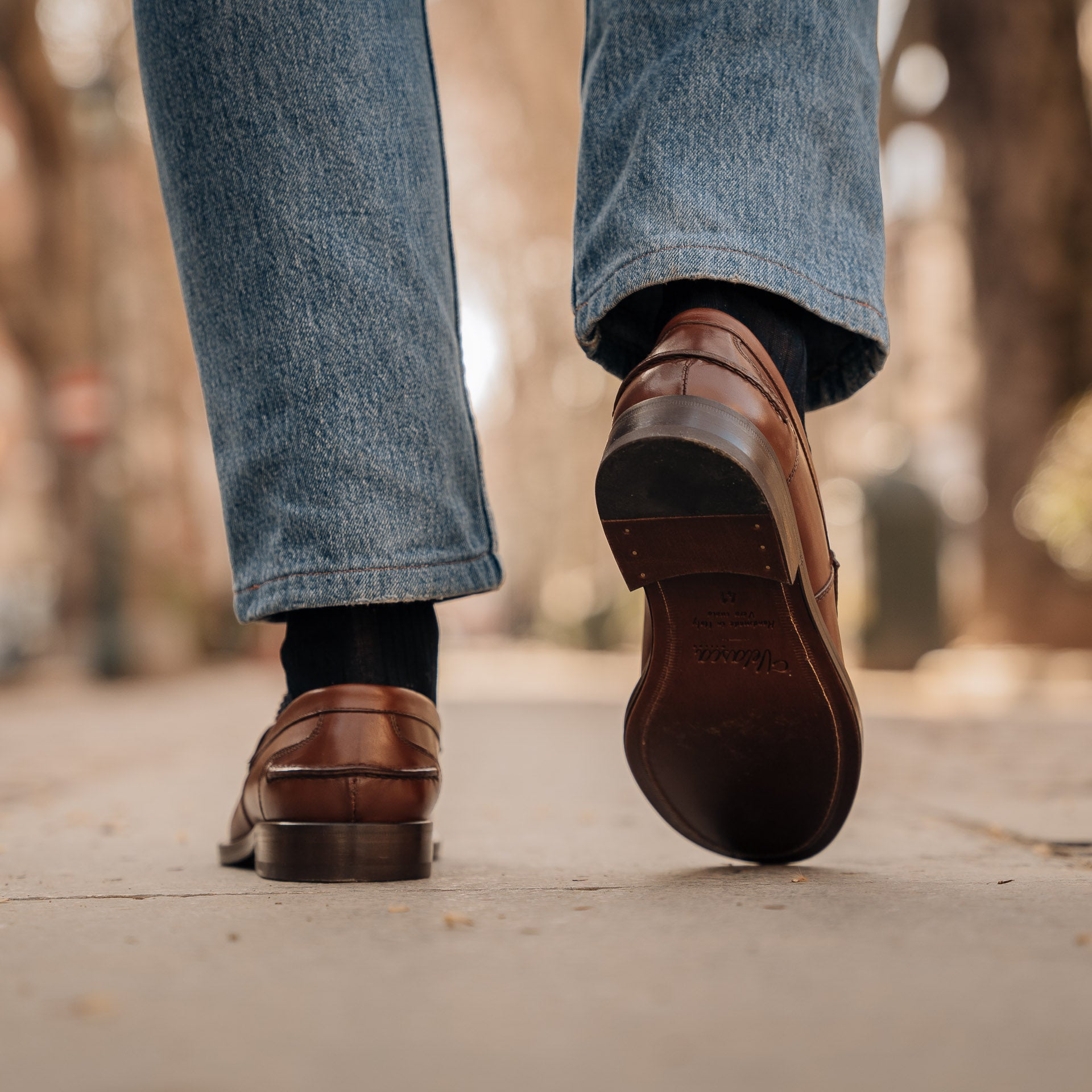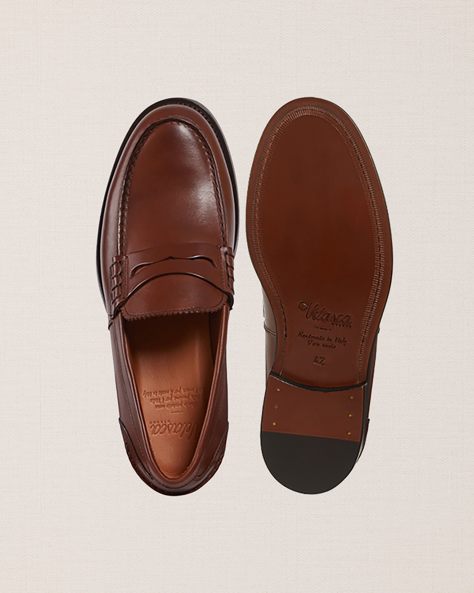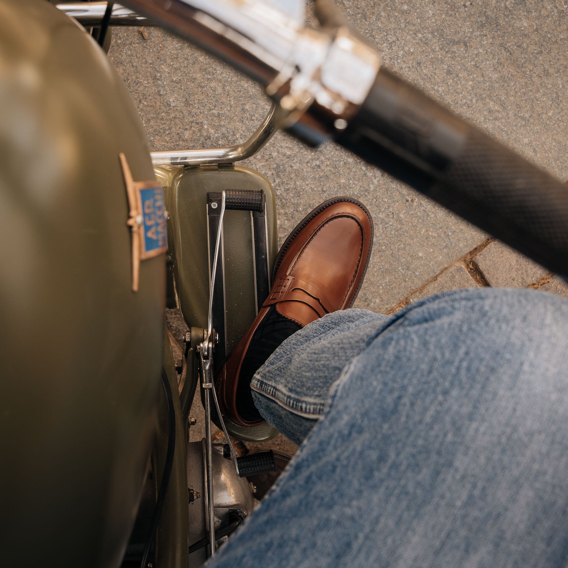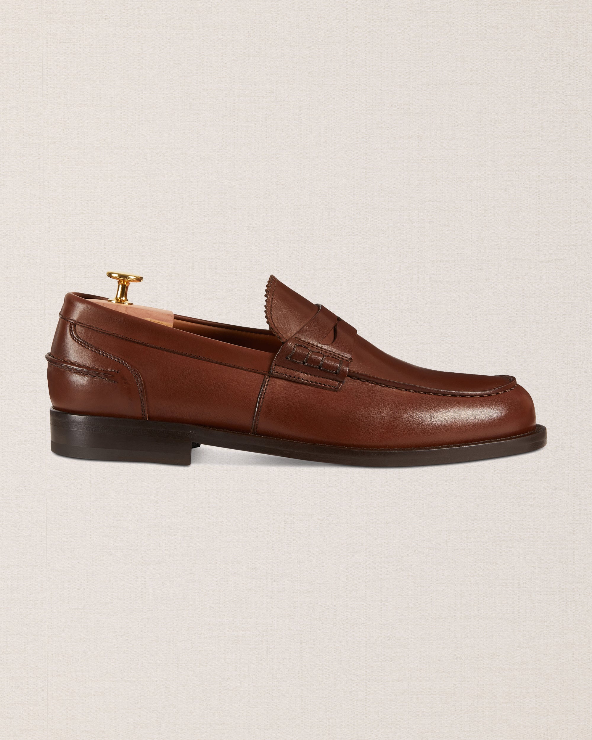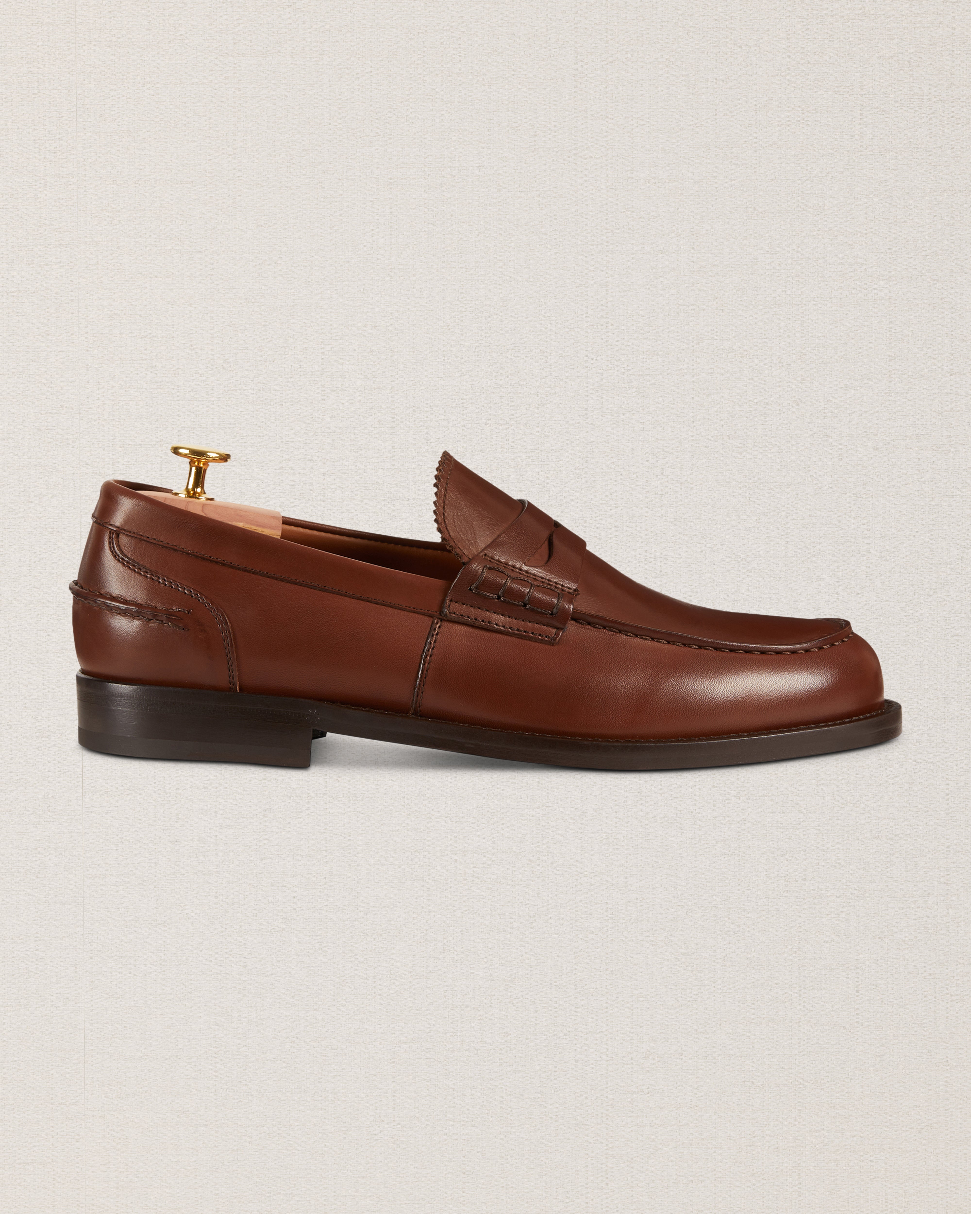 The Penny Loafer with the traditional toe, made from smooth calfskin with a classic leather sole. Wear this simple shoe effortlessly with casual or more formal outfits – it remains iconic. We, for example, paired it with a blue merino crew-neck and light denim trousers.