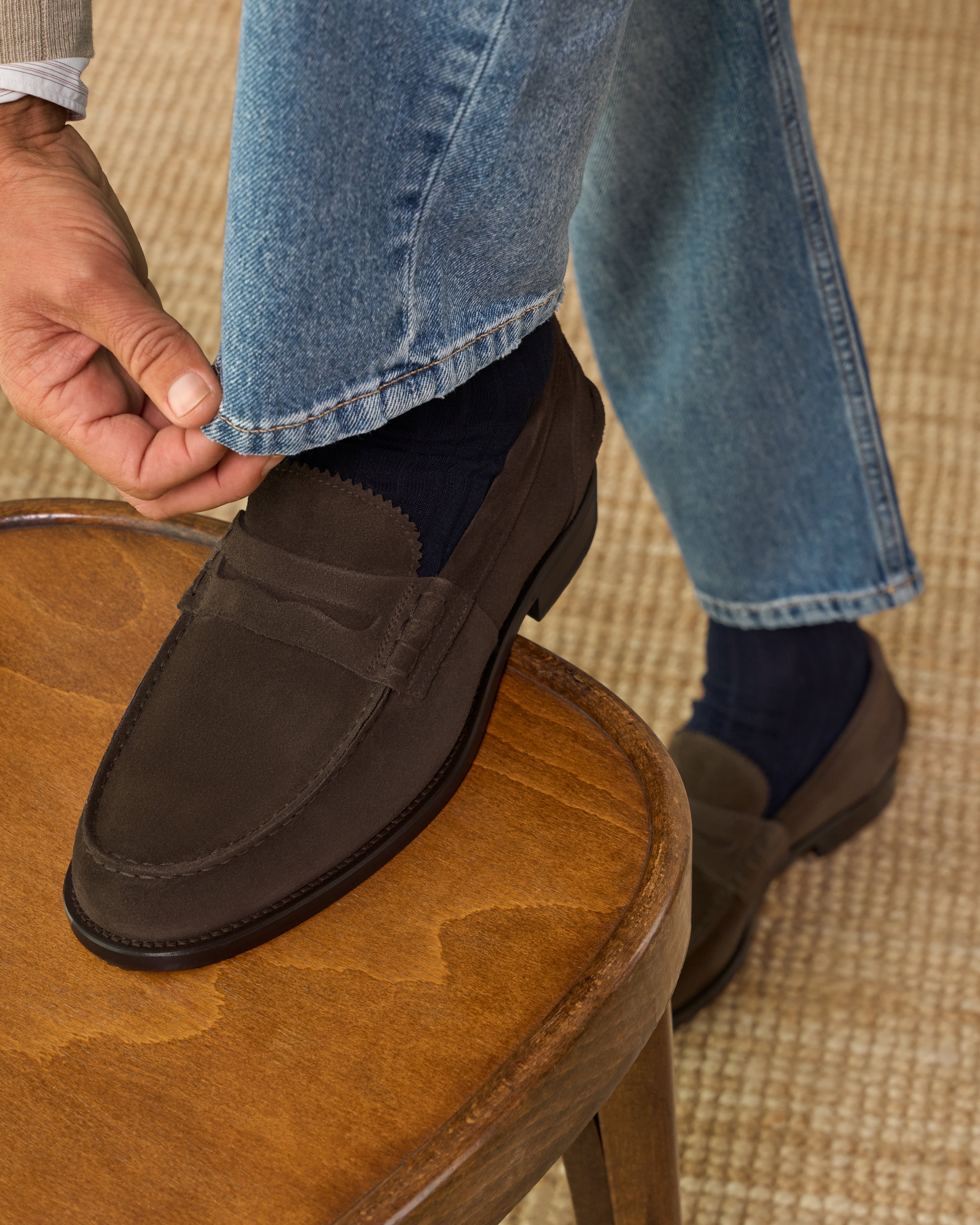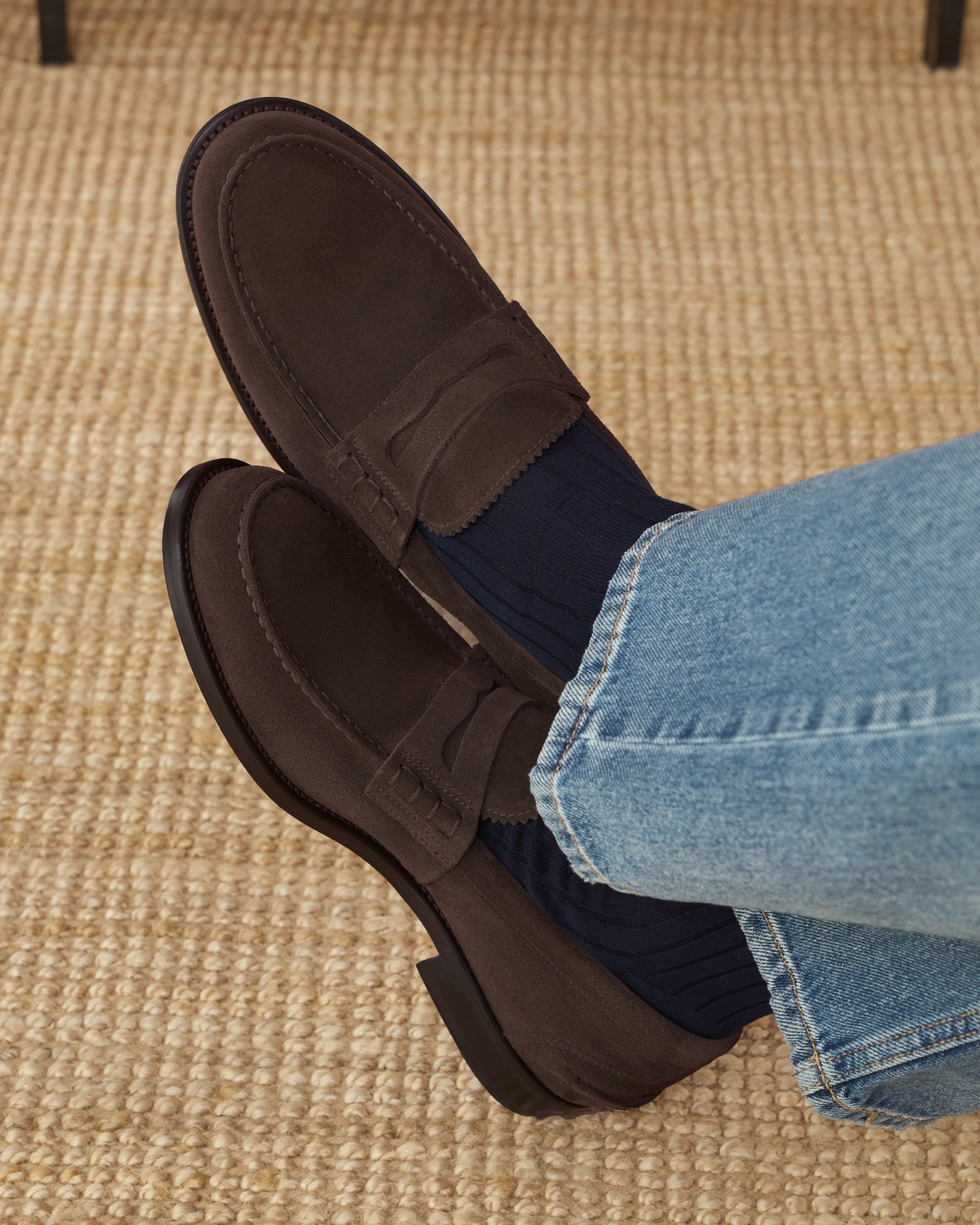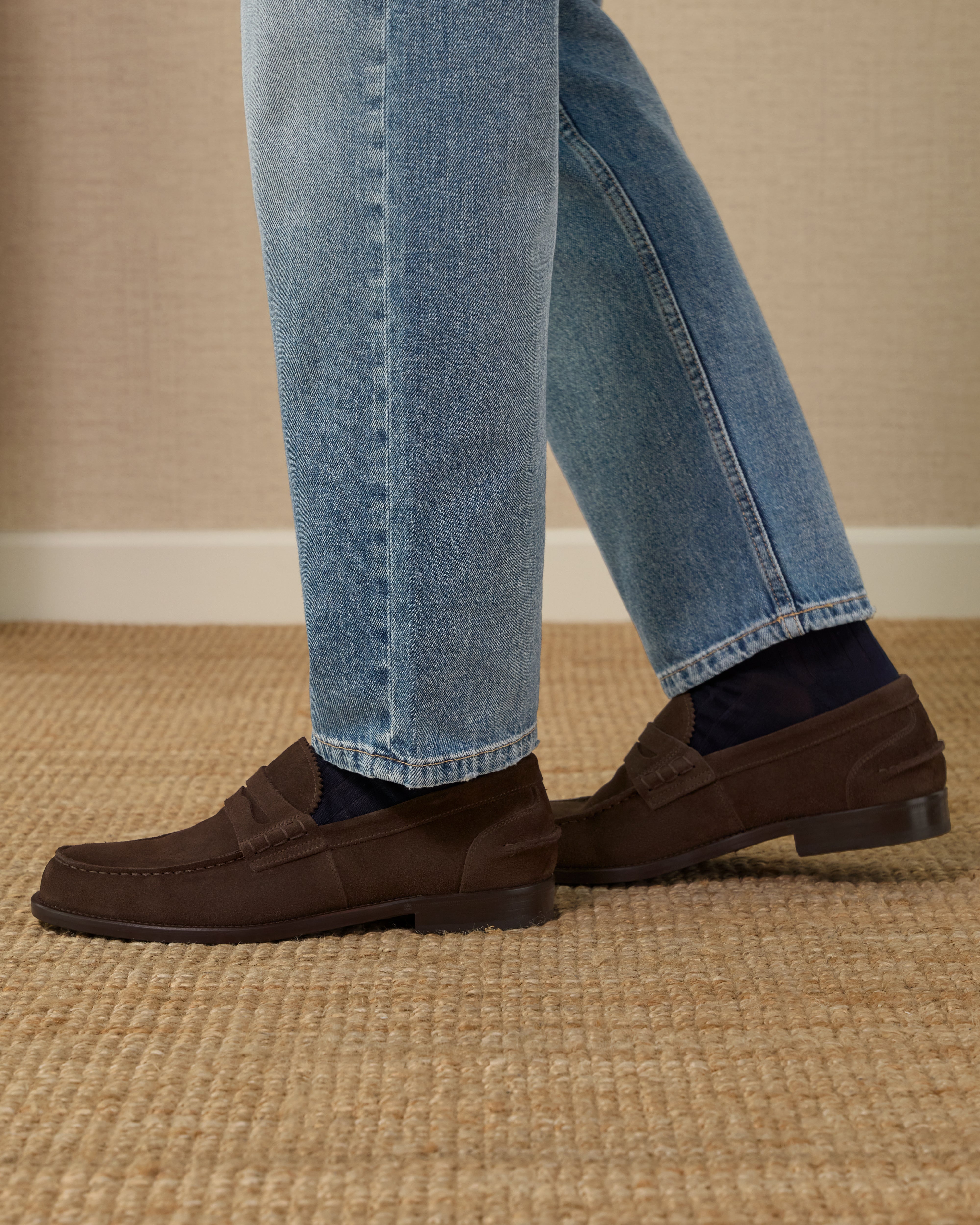 The Penny Loafer with the traditional toe, a simple shoe that remains iconic. Made from suede calfskin with a classic leather sole, it is casual by nature. We paired it with a total denim look.