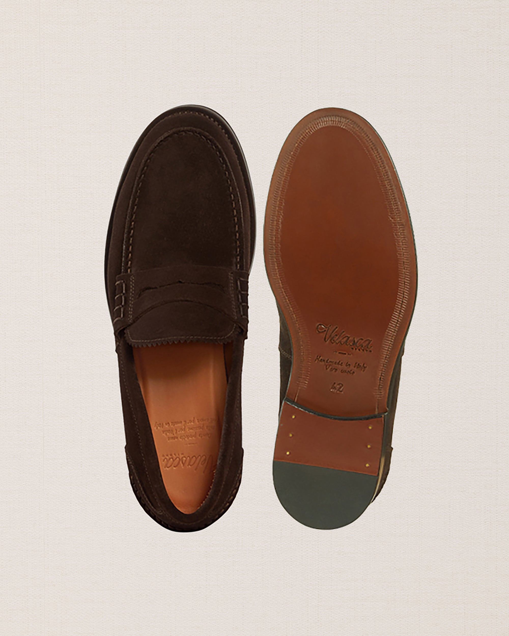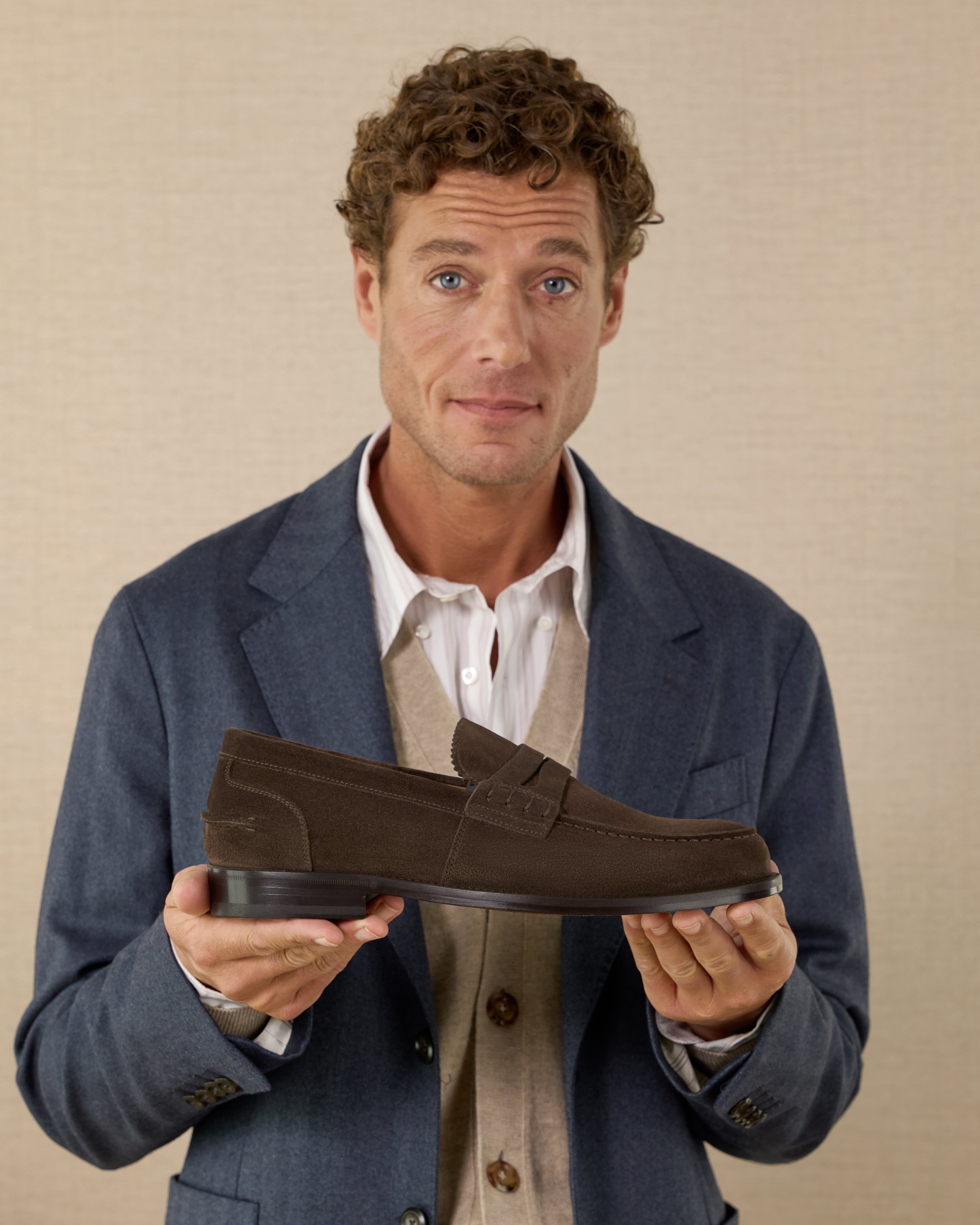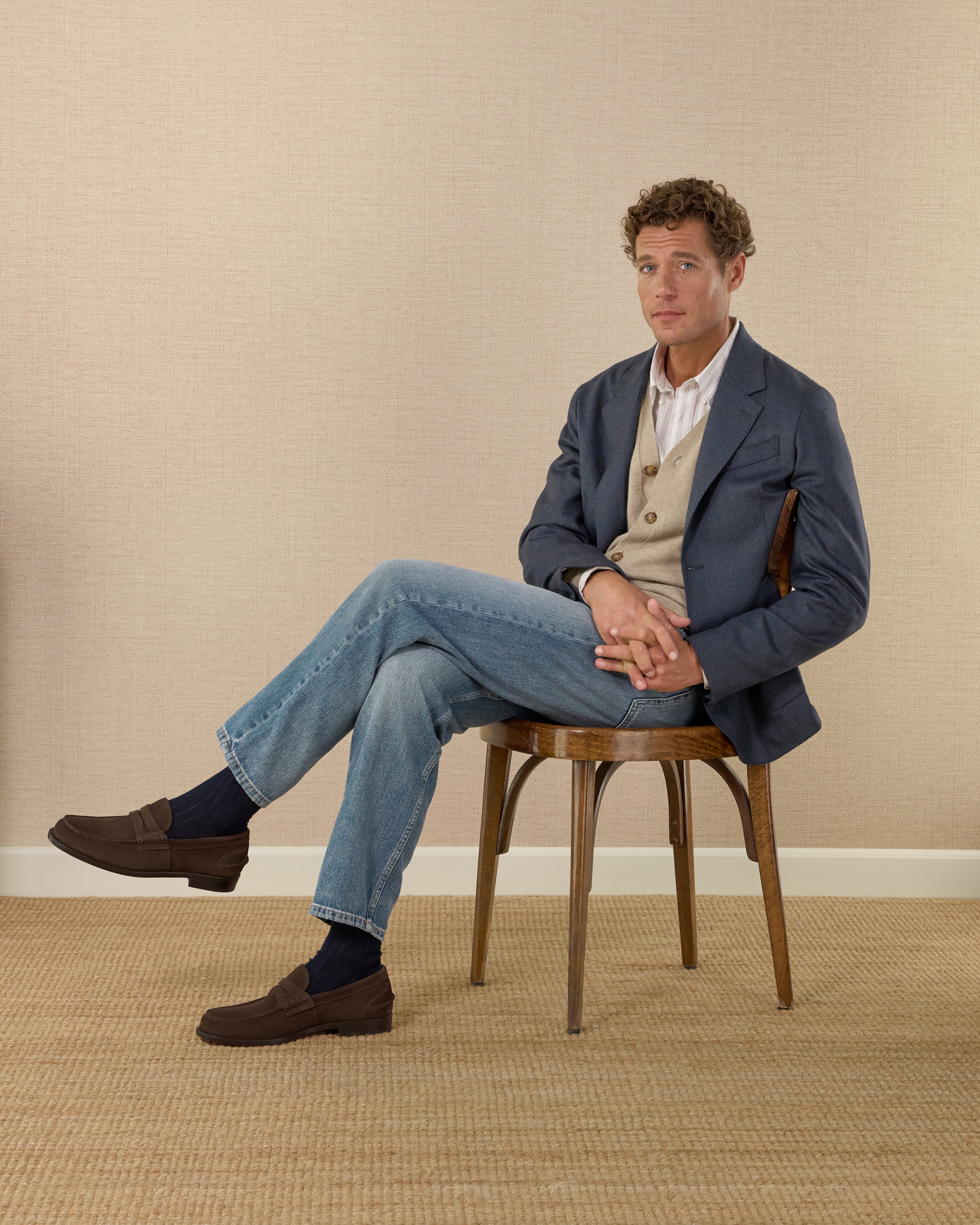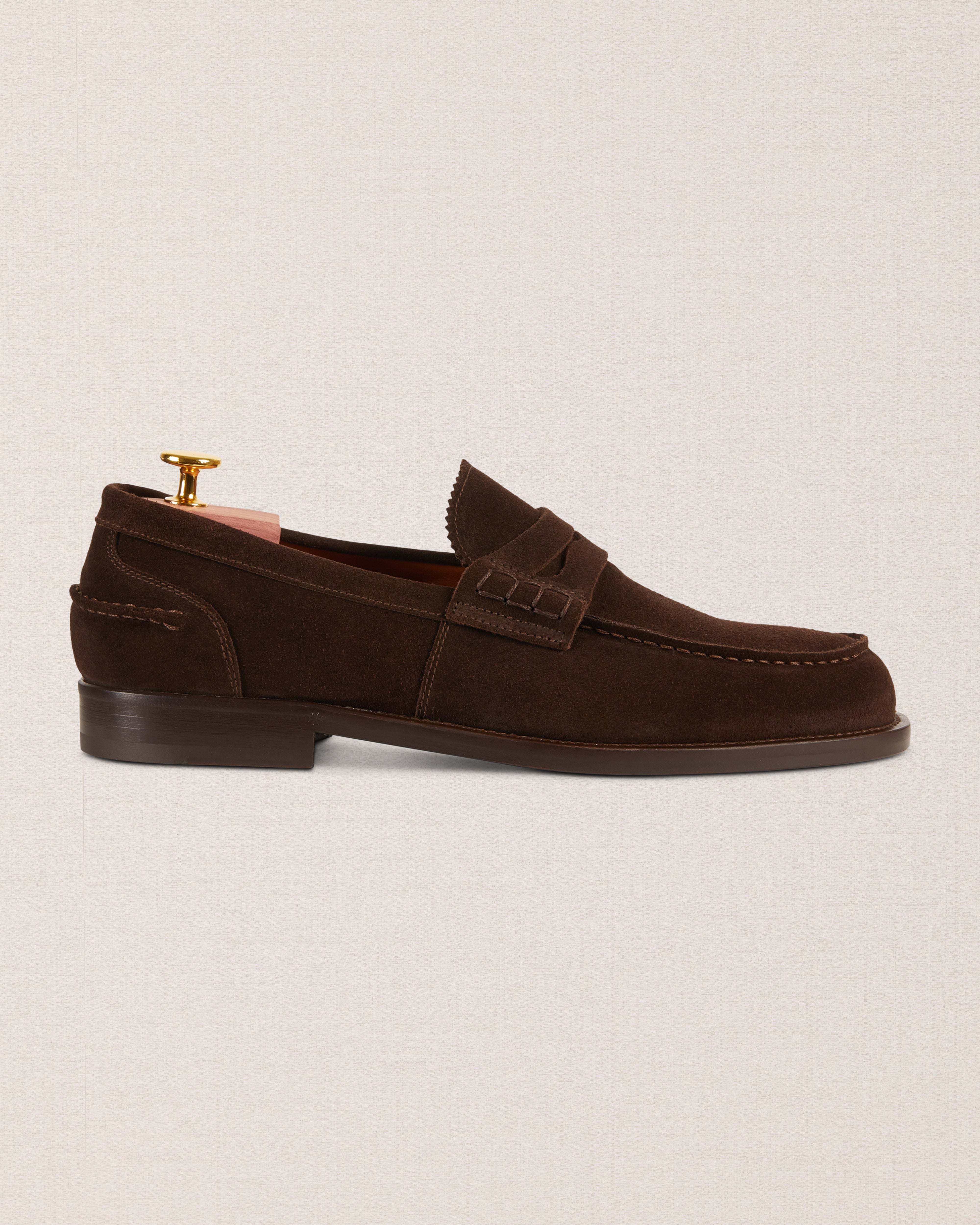 The Penny Loafer with the traditional toe, a simple shoe that remains iconic. Made from suede calfskin with a classic leather sole, it is casual by nature. We paired it with a total denim look.