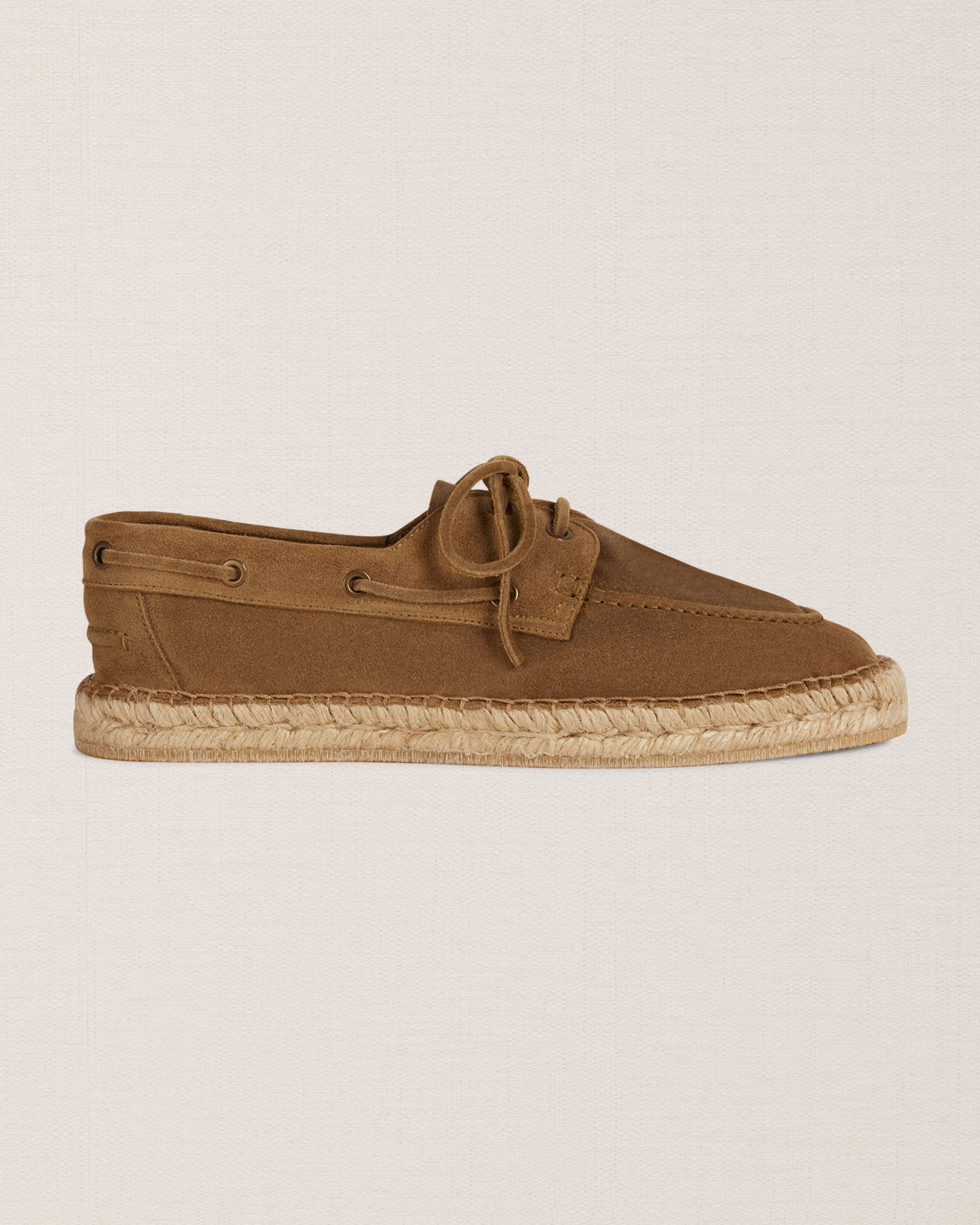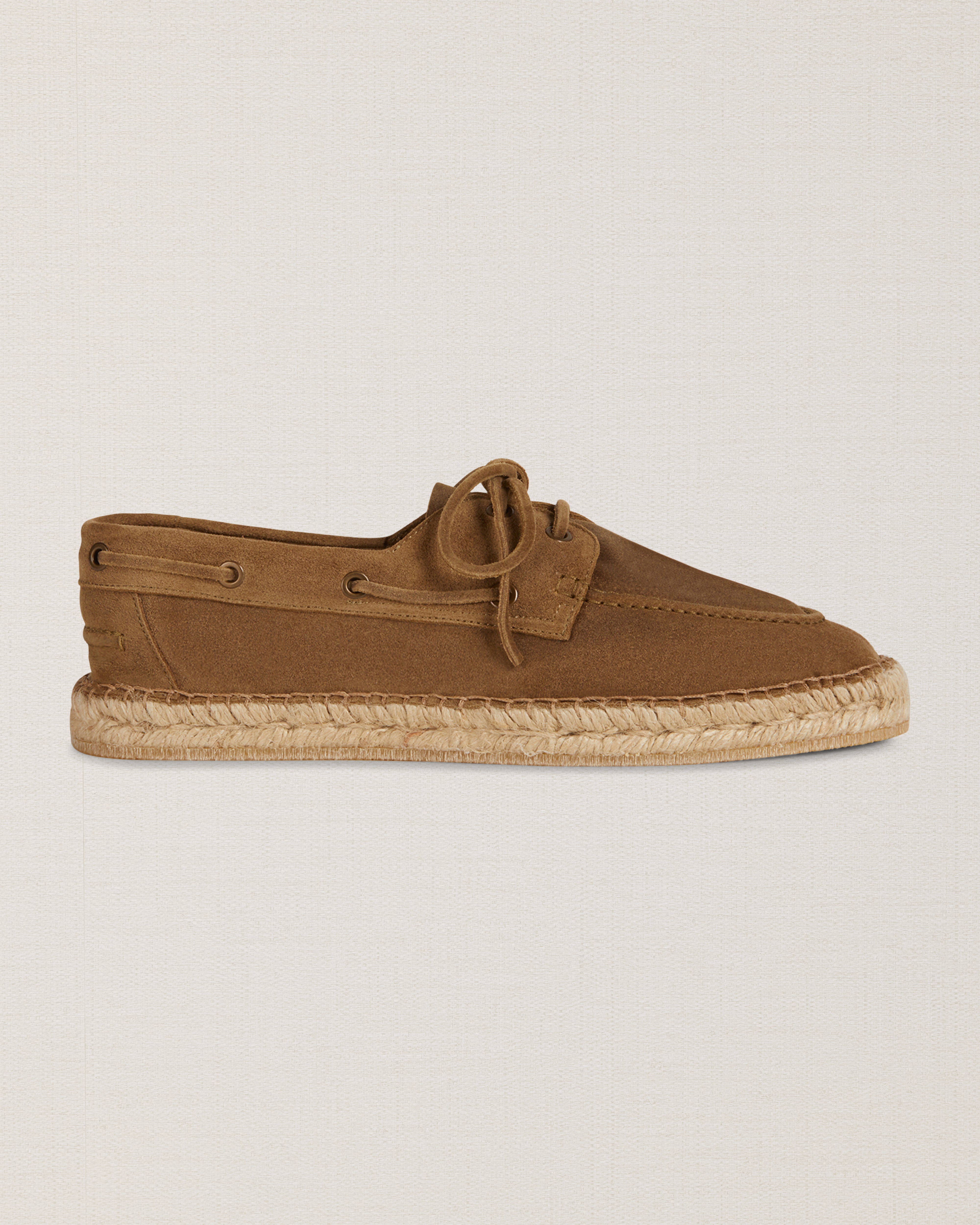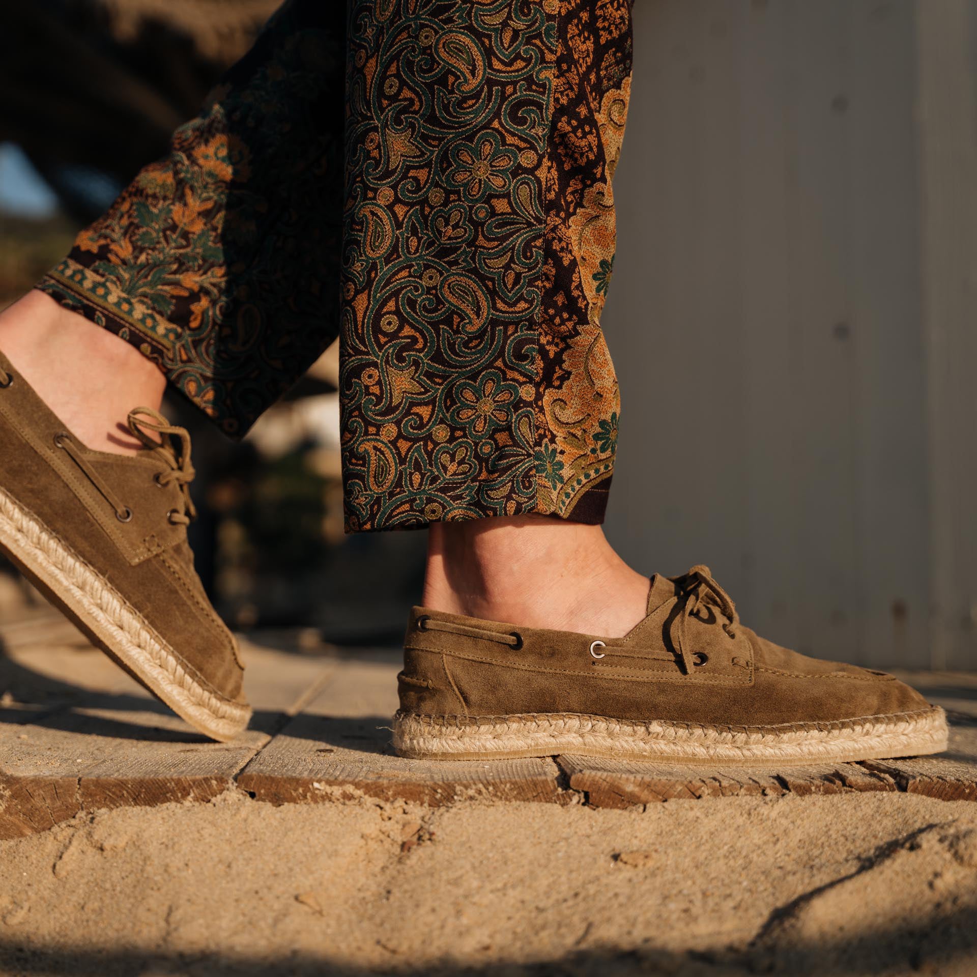 Our espadrilles inspired by the sailing tradition, in suede calfskin. The leather upper is joined to the sole with a hand-stitched seam. Here it meets hand-woven rope and rubber. With a linen safari jacket, a grey melange T-shirt and a pair of soft patterned trousers, it’s down to the beach.