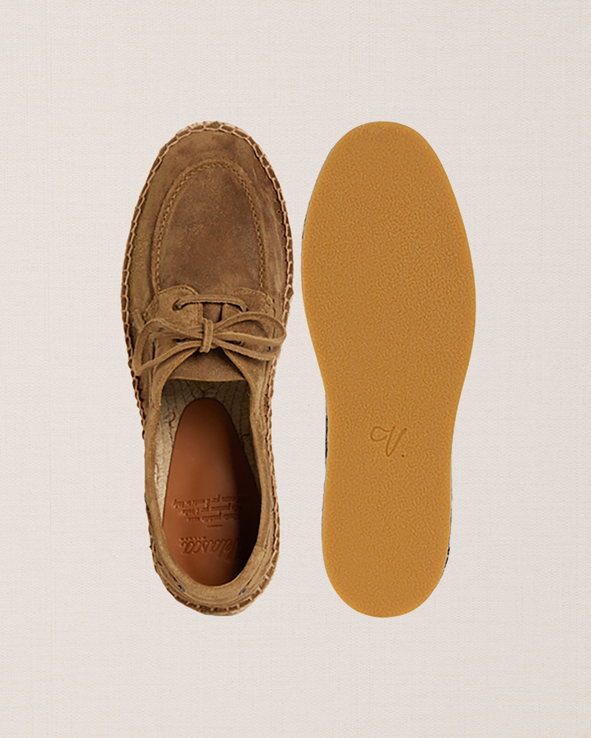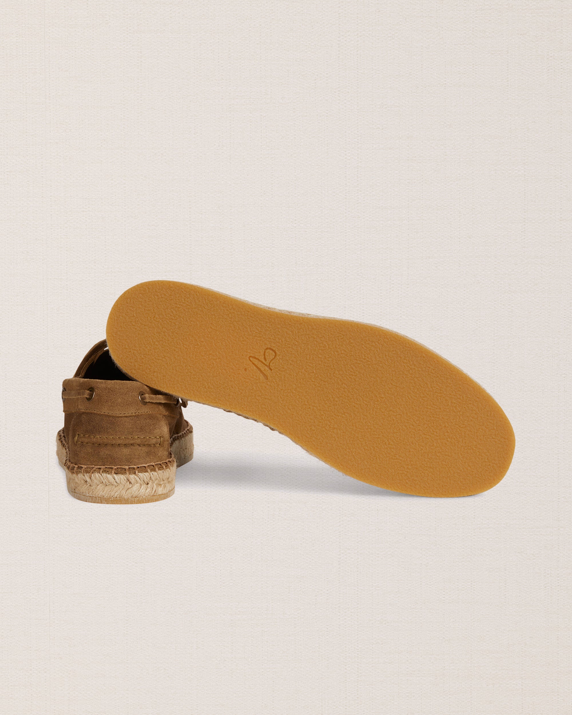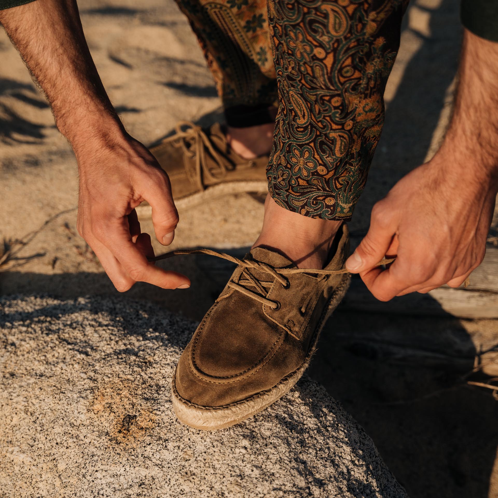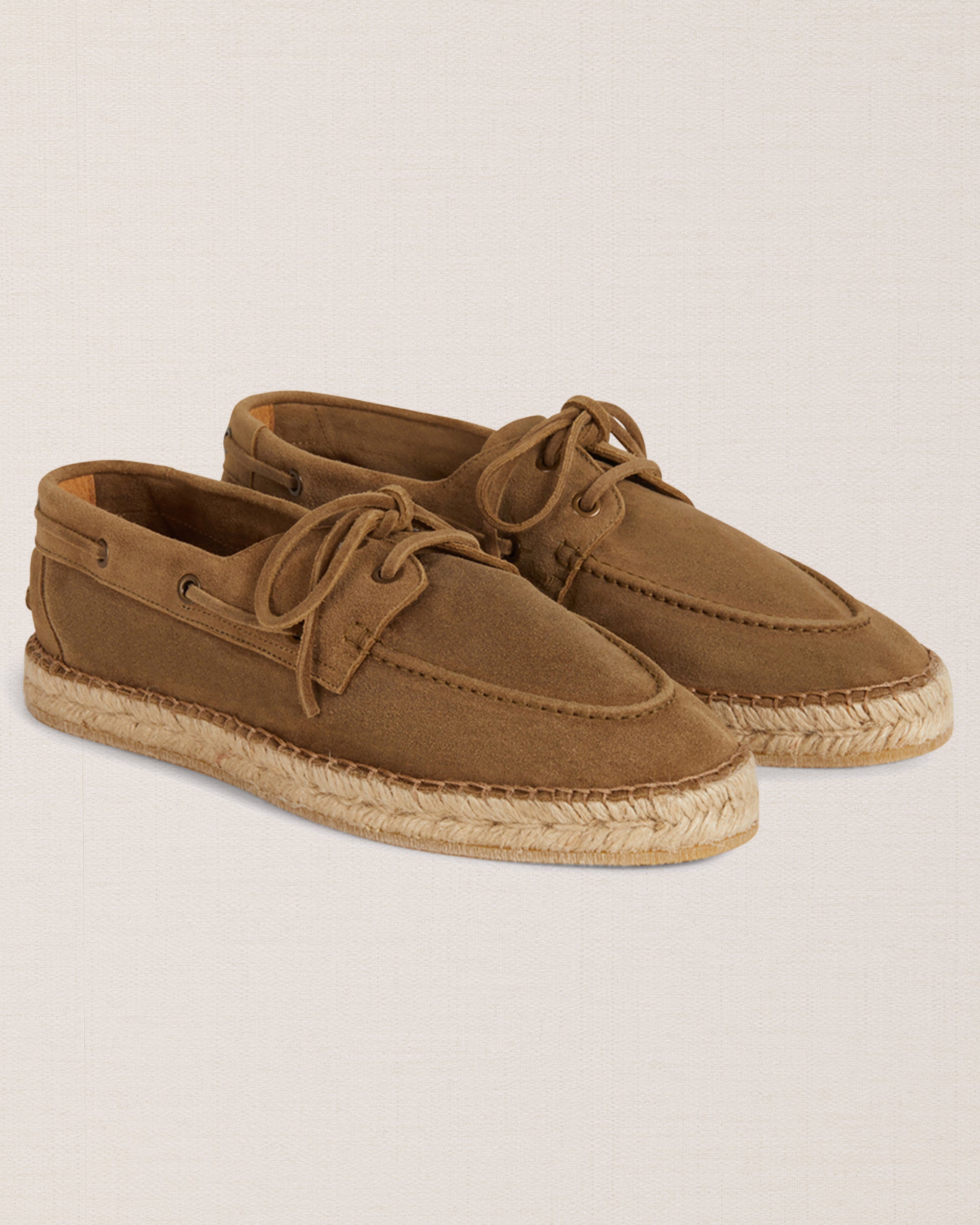 Our espadrilles inspired by the sailing tradition, in suede calfskin. The leather upper is joined to the sole with a hand-stitched seam. Here it meets hand-woven rope and rubber. With a linen safari jacket, a grey melange T-shirt and a pair of soft patterned trousers, it’s down to the beach.