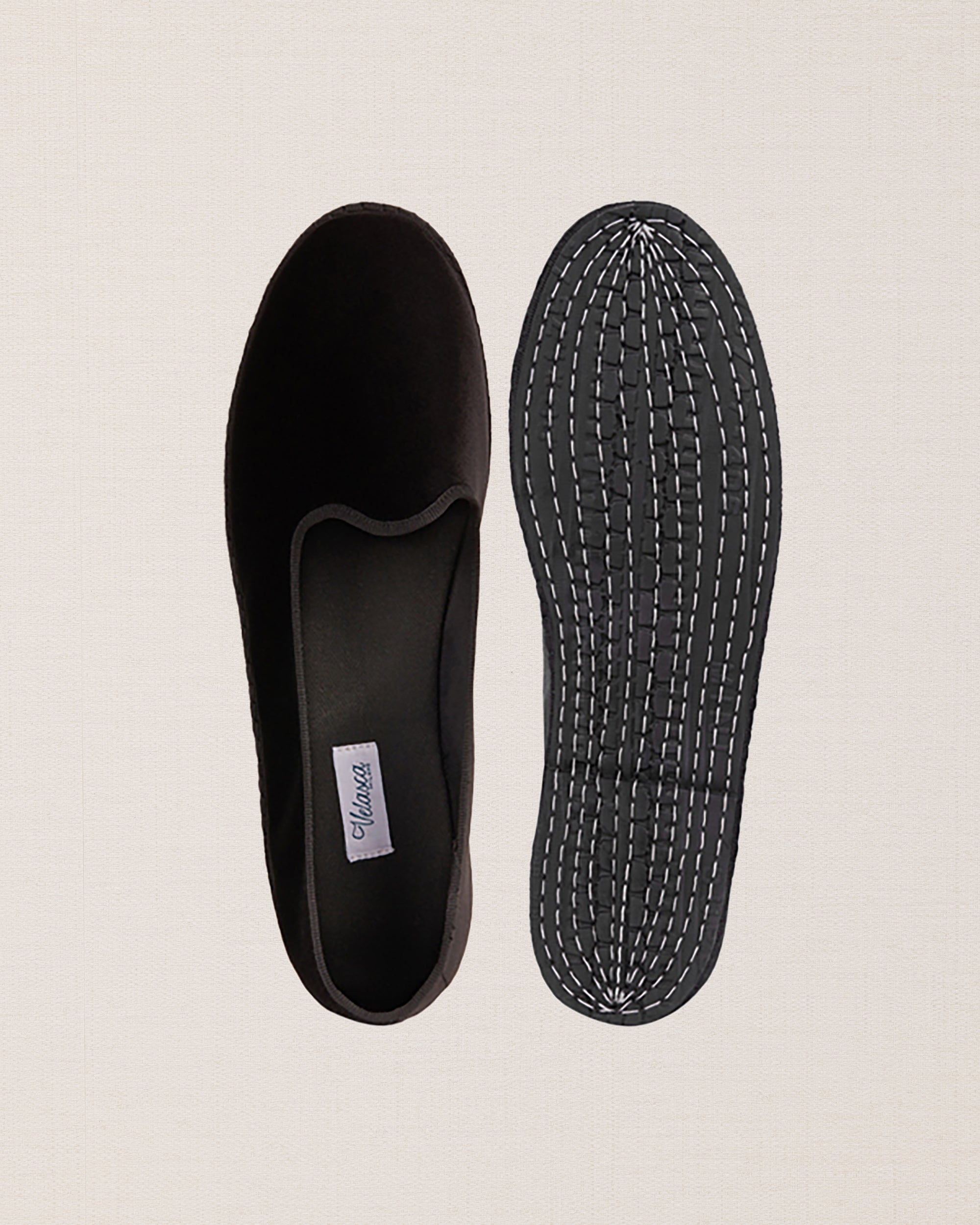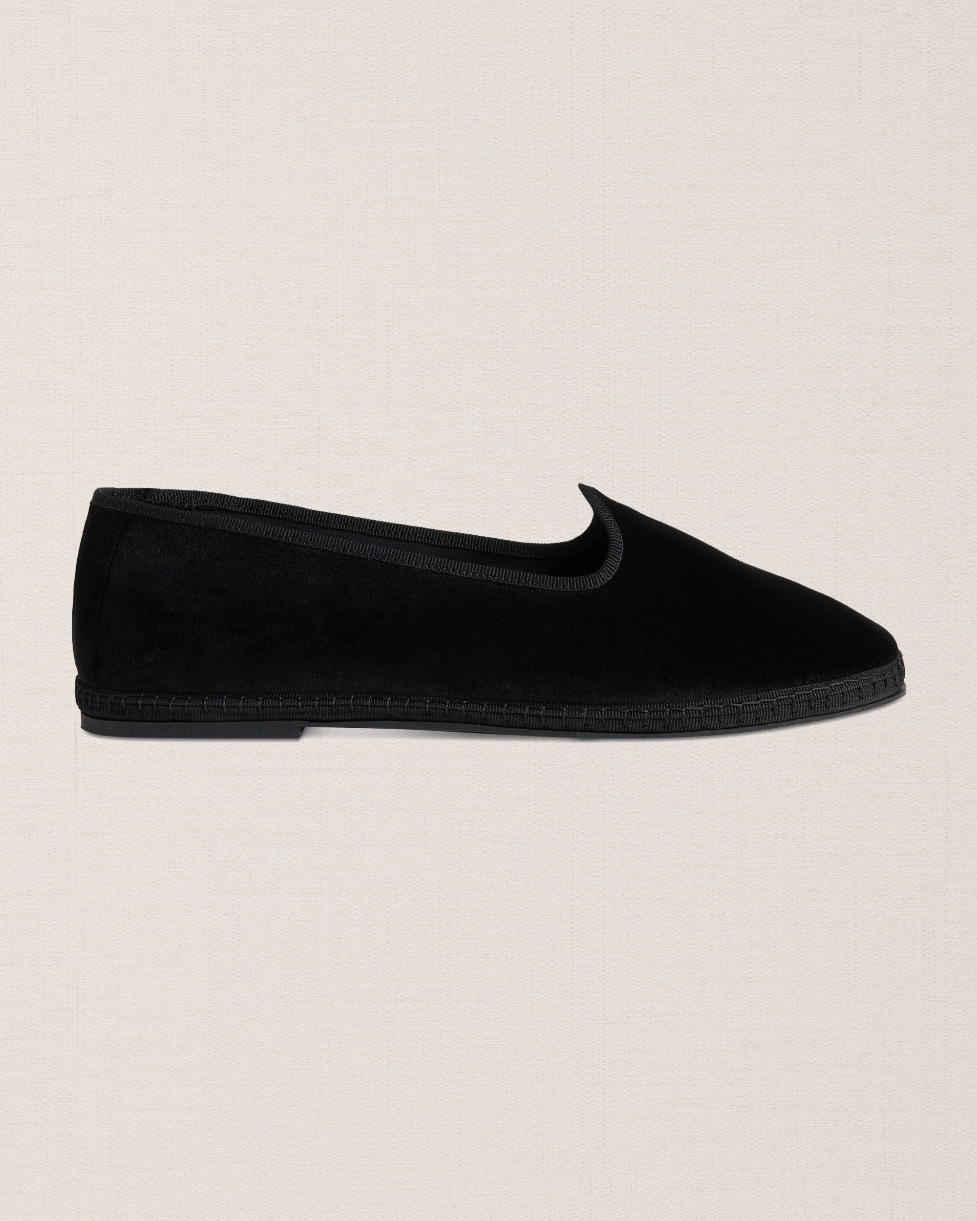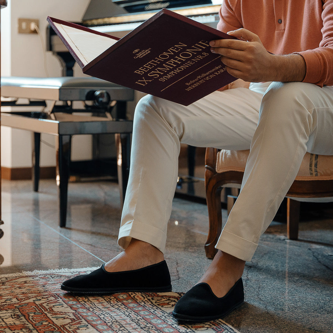 Friulane shoes (or call them Furlanes) are the historical shoes of Friulian tradition: simple lines combined with refined black velvet, fresh cotton lining and rubber sole. They were originally homemade by women from villages in the mountains, then they found new life among the Venetian canals: the gondoliers needed a comfortable, stable and delicate shoe on the wood. The hand stitching has remained just as it once was: hands make each shoe a unique piece with their irregular motion. Today these shoes are a symbol of elegance: wear them with cotton and cream-coloured linen trousers, with pleats, and jersey polo shirts in peach tones. Let them be your slippers at home, if you are one of those who never give up class.