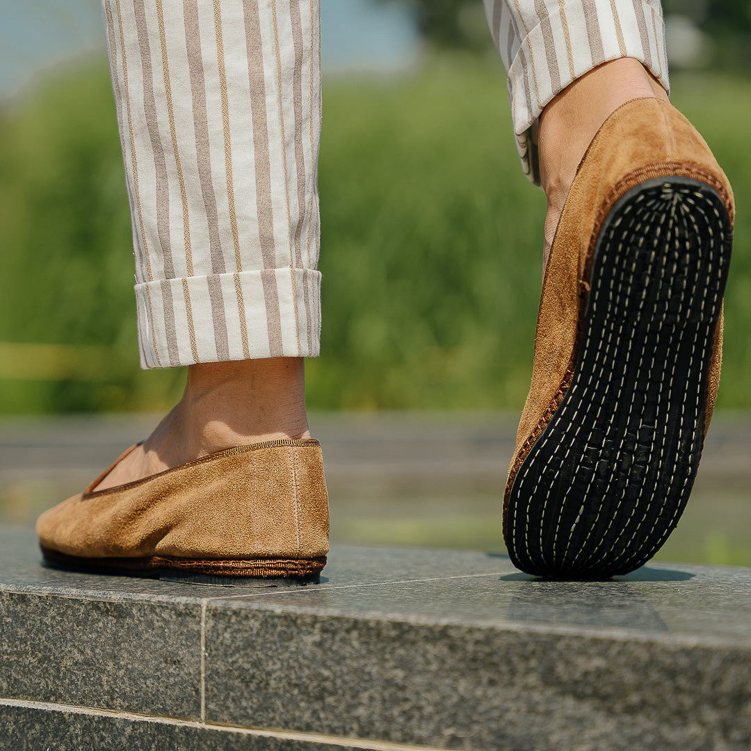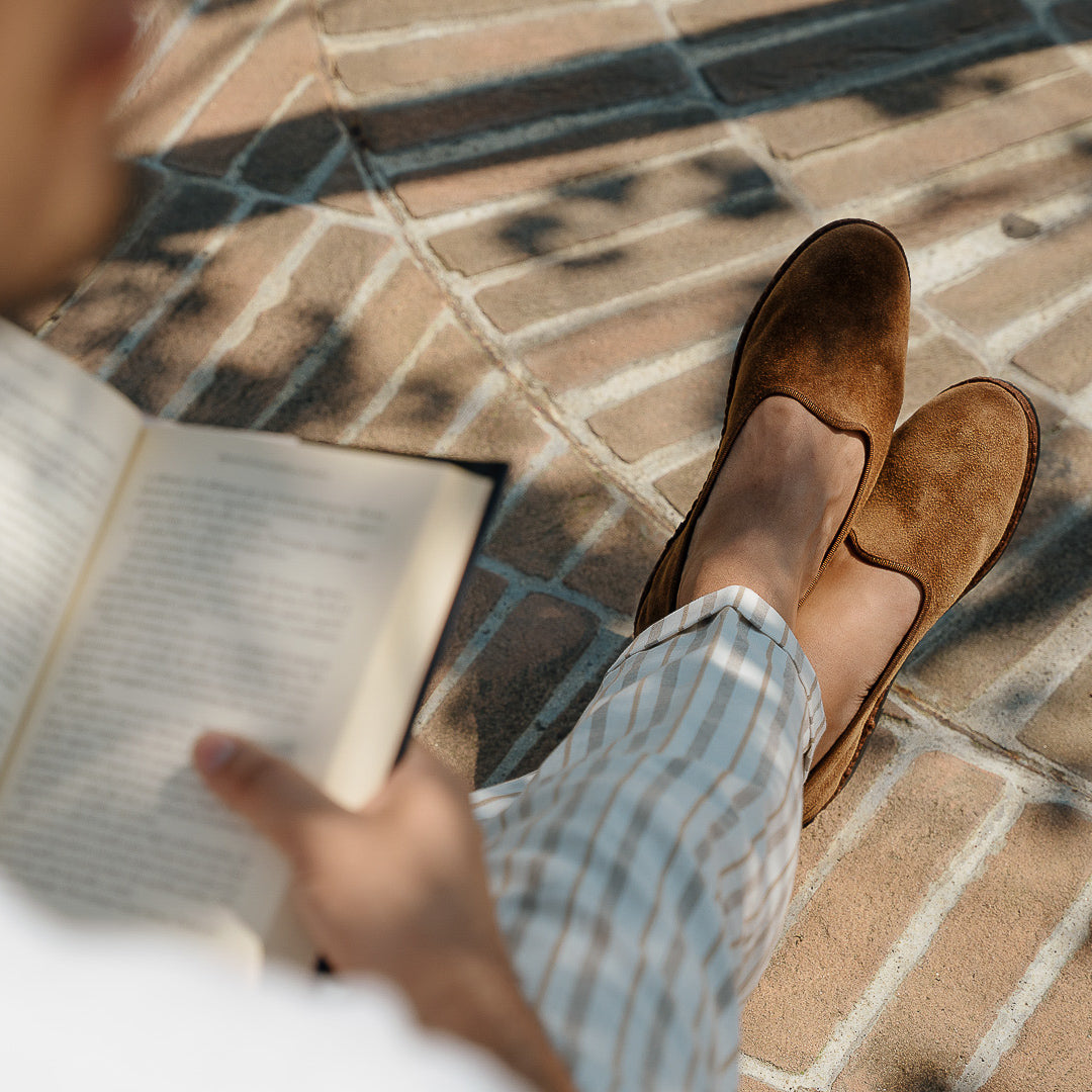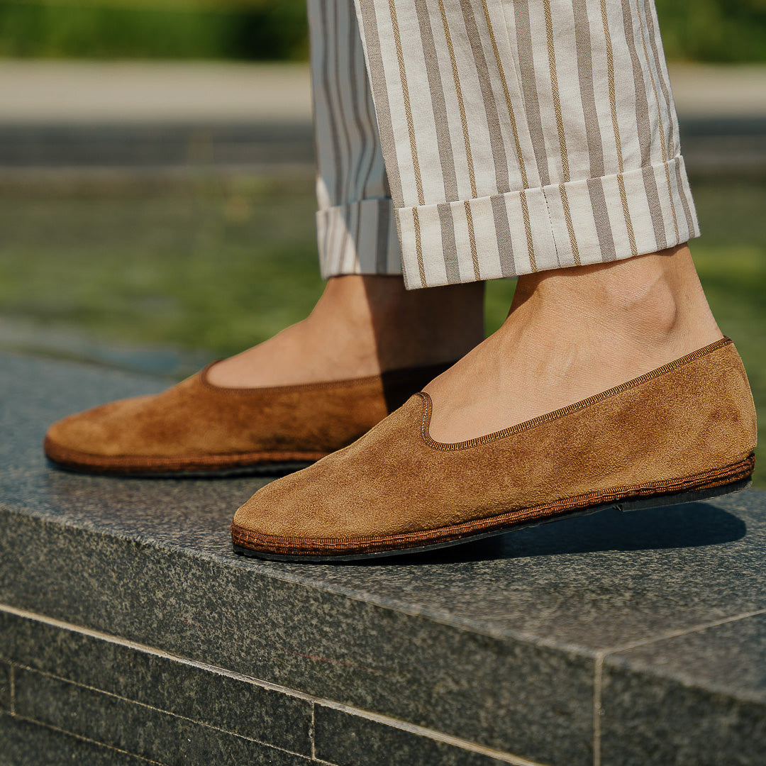 Friulane shoes (or call them Furlanes) are the historical shoes of Friulian tradition: simple lines combined with suede, unlined and with a rubber sole. They were originally homemade by women from villages in the mountains, then they found new life among the Venetian canals: the gondoliers needed a comfortable, stable and delicate shoe on the wood. The hand stitching has remained just as it once was: hands make each shoe a unique piece with their irregular motion. Today these shoes are a symbol of elegance: wear them with striped cream-toned trousers. Relax in the park, memories to be shot with a polaroid.